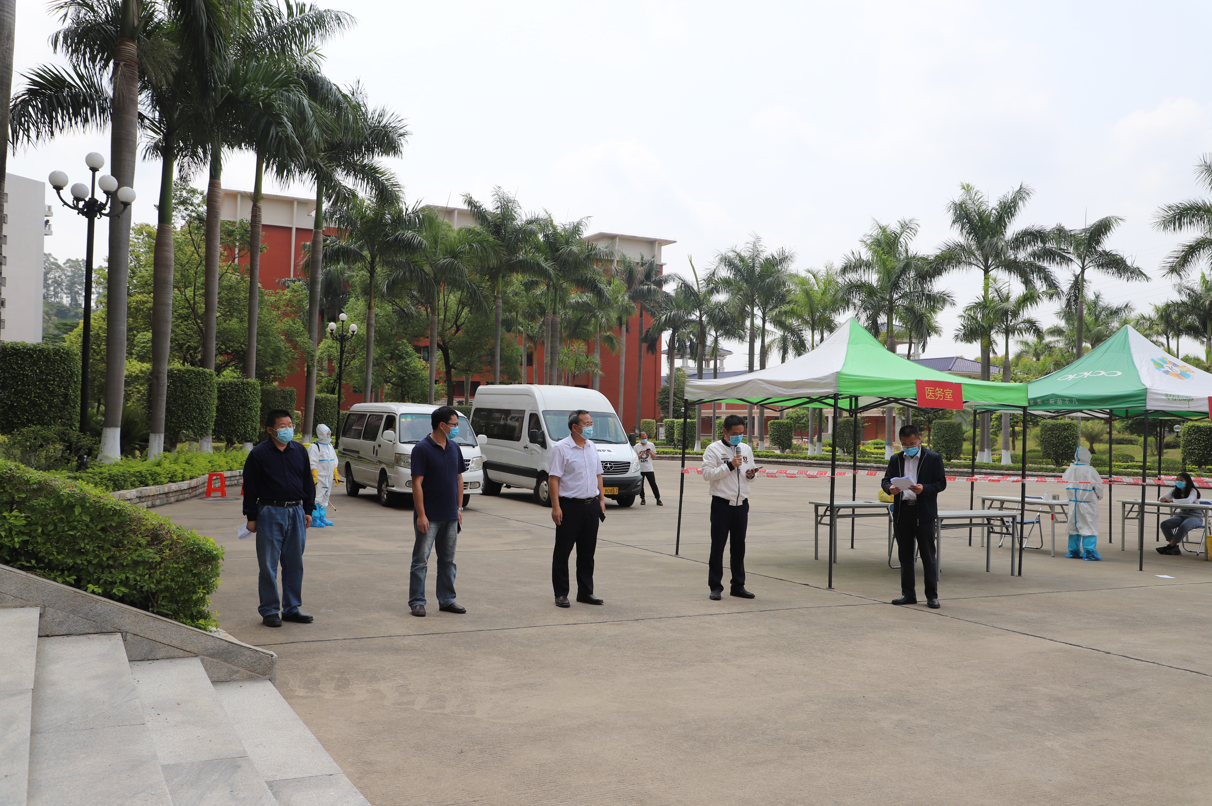 學校疫情防控領導小組、學校公共衛(wèi)生應急處理小組成員參加此次模擬演練,增城區(qū)教育局副局長梁多、市疾控中心增城區(qū)張齊光科長、增江街黨工委副書記袁冰莉和象山居委會等有關領導,學校校長劉莊、黨委書記林偉健出席,華立園各學校領導、干部和部分教師觀摩了本次模擬演練。