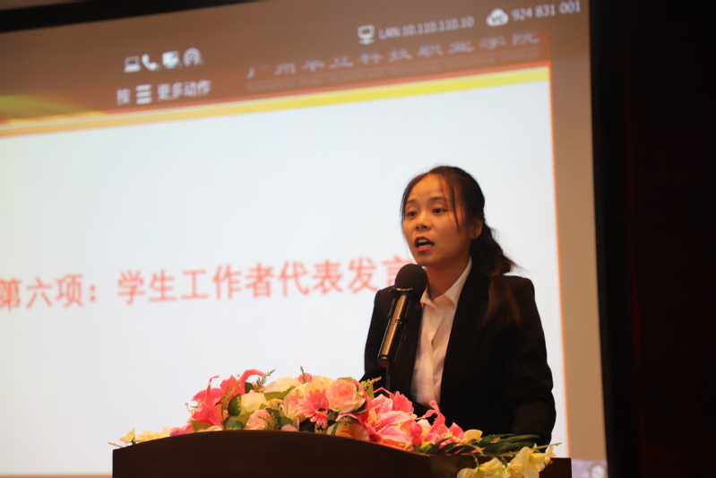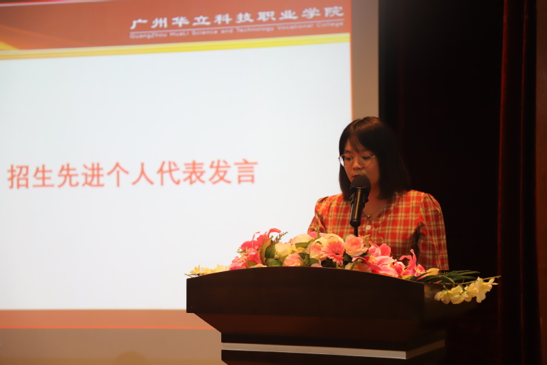 優(yōu)秀招生人員代表宋依謎老師在發(fā)言中從招生宣傳、招生方式等方面仔細地介紹自己的招生工作,表示從一名普通輔導員成為具有一定招生能力的教師,自己的成長離不開學校的栽培,心里充滿感恩,充滿動力,對未來充滿信心。