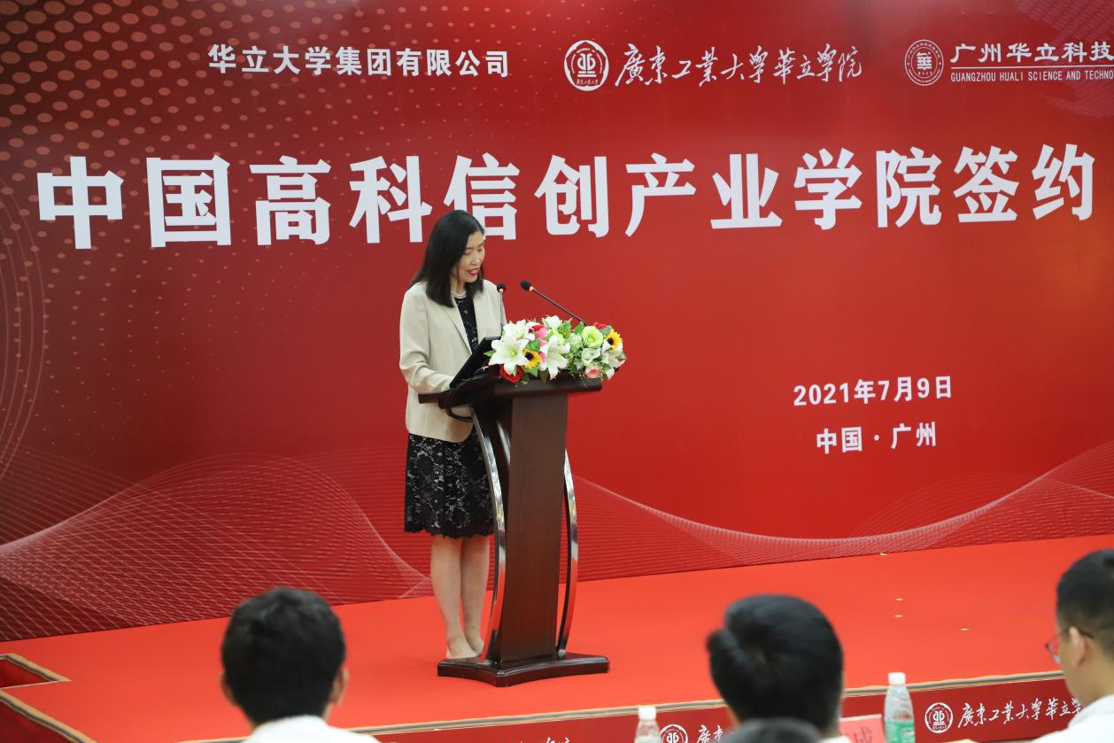 中國高科集團總裁朱怡然發(fā)表致辭,向積極促成此次合作的領(lǐng)導(dǎo)與嘉賓表達了誠摯的感謝,并對“中國高科信創(chuàng)產(chǎn)業(yè)學(xué)院”的前景寄予充分的期待。在校企合作、培育人才的過程中,中國高科集團始終緊密貼合《現(xiàn)代產(chǎn)業(yè)學(xué)院建設(shè)指南(試行)》中有關(guān)“要建設(shè)若干與地方政府、行業(yè)企業(yè)等多主體共建共管共享的現(xiàn)代產(chǎn)業(yè)學(xué)院”、“推動學(xué)校人才培養(yǎng)供給側(cè)與產(chǎn)業(yè)需求側(cè)緊密對接”、“引導(dǎo)行業(yè)企業(yè)深度參與教材編制和課程建設(shè),設(shè)計課程體系、優(yōu)化課程結(jié)構(gòu)”等要求,與院校聯(lián)合進行深度產(chǎn)教融合下的專業(yè)人才培養(yǎng)。朱總裁表示,中國高科信創(chuàng)產(chǎn)業(yè)學(xué)院是中國高科集團與華立大學(xué)集團院共同努力下的碩果,是多層次聯(lián)合教學(xué),多專業(yè)交叉復(fù)合,專業(yè)集群支持產(chǎn)業(yè)集群發(fā)展的一次大膽嘗試,也是院校端、企業(yè)端、產(chǎn)業(yè)端攜手深化產(chǎn)教融合的必然結(jié)果。中國高科集團希望能夠與華立大學(xué)集團強強聯(lián)手,助力華立的教育發(fā)展,為大灣區(qū)專業(yè)人才培養(yǎng)提供創(chuàng)新思路和發(fā)展范式,實現(xiàn)發(fā)展共贏。