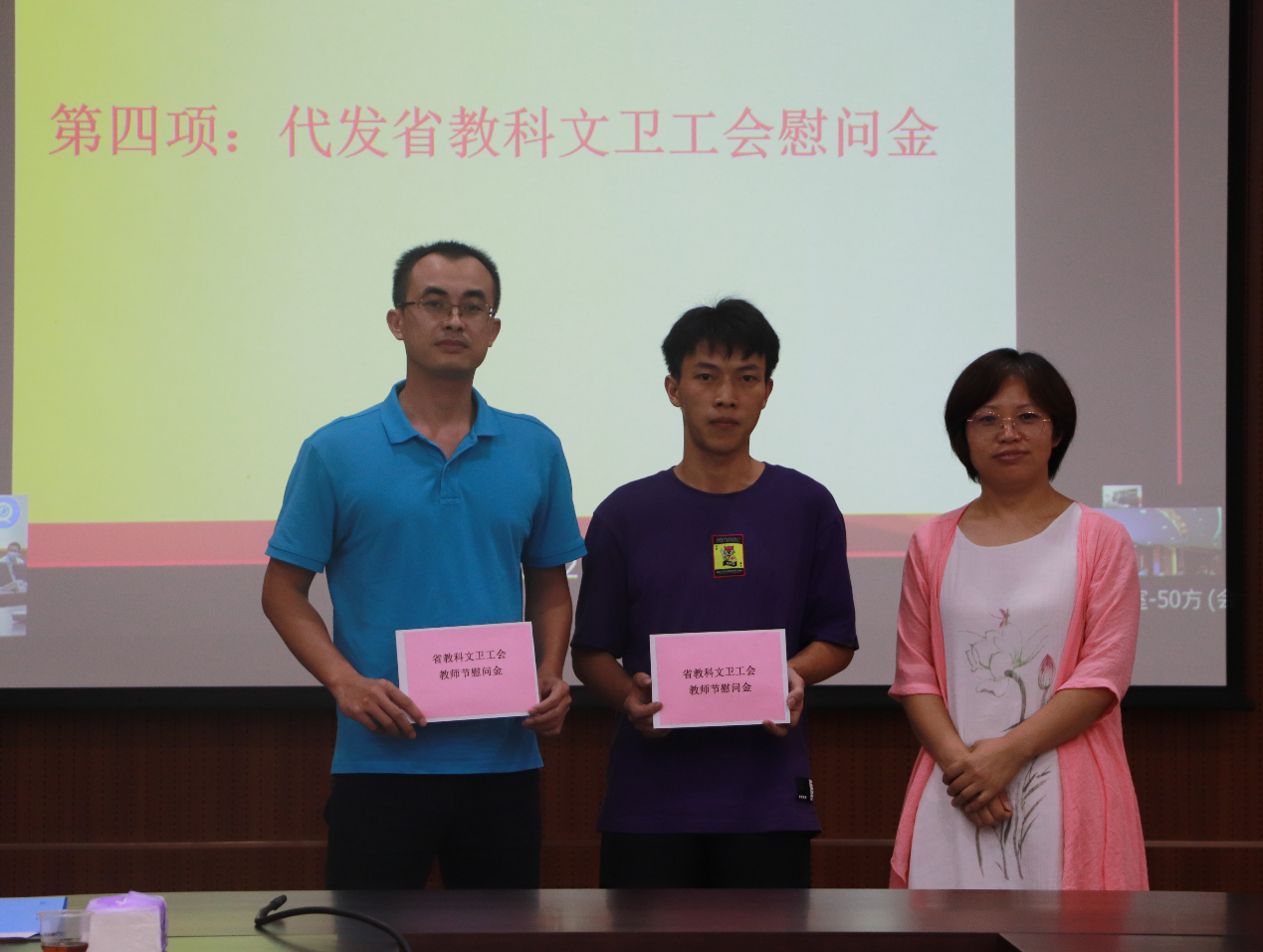 在今天隆重又簡樸的日子,省教科文衛(wèi)工會(huì)慰問我校困難教師,由學(xué)校代發(fā)慰問金。