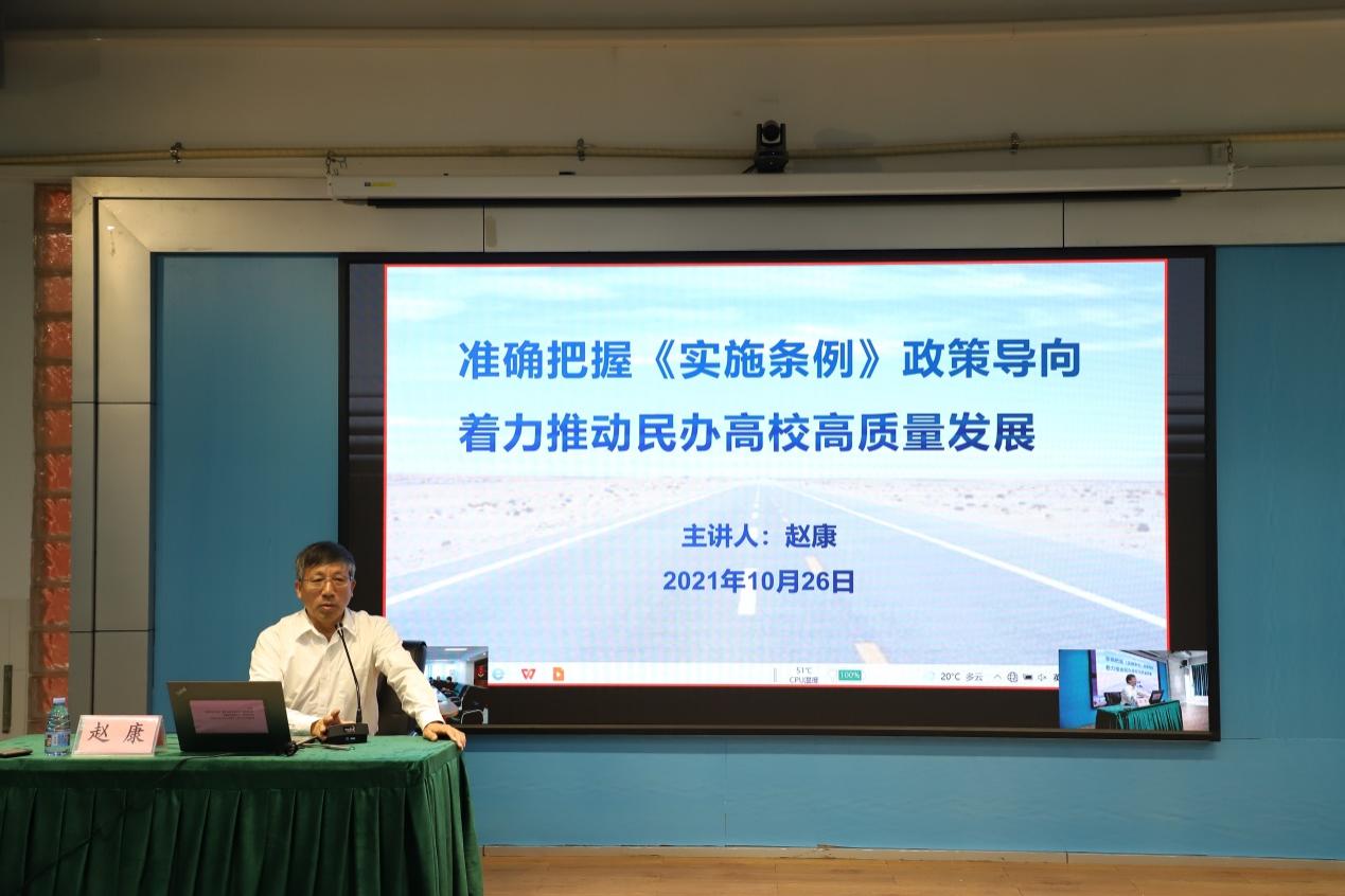 在報告會上,趙康教授主要從深刻認識民辦教育新法新政的時代意義、準確把確握《實施條例》的政策法律導向、轉(zhuǎn)變觀念促進民辦教育健康高質(zhì)量發(fā)展這三個方面做出深入分析講解。趙康教授通過對《實施條例》深入淺出的講解,讓與會人員更深刻認識民辦教育新法新政的時代意義,以全力促進我省民辦教育健康高質(zhì)量發(fā)展為切入點,結(jié)合目前國內(nèi)外民辦教育的發(fā)展現(xiàn)狀,詳細介紹并分析了我國民辦學校的發(fā)展進程和問題,深入透徹解讀了《實施條例》的政策精神。趙康教授用生動的語言,翔實舉例說明讓大家更好地理解非營利性辦學、營利性辦學之間的差異性,也讓我們從辦學理念、職教發(fā)展、招生規(guī)范、民辦教師待遇、養(yǎng)老等方面深入全面認識《實施條例》的政策精神。