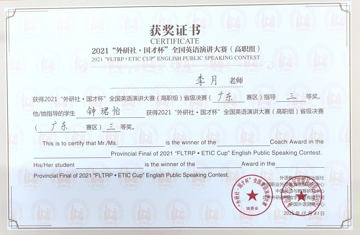 鐘珺怡同學獲2021“外研社·國才杯”全國英語演講大賽(高職組)省級決賽(廣東賽區(qū))三等獎