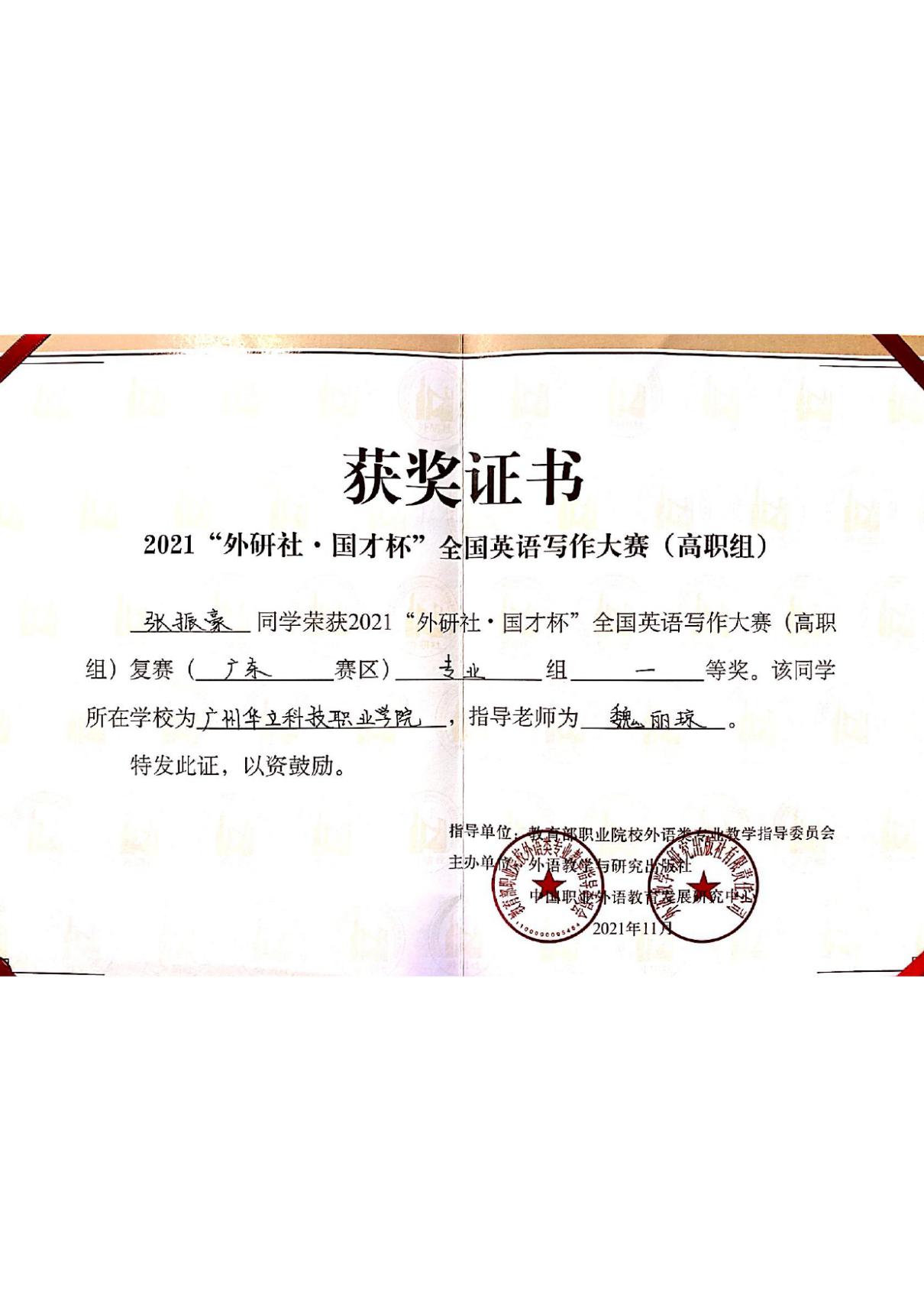 張振豪同學獲2021“外研社·國才杯”全國英語寫作大賽(高職組)復賽(廣東賽區(qū))專業(yè)組一等獎