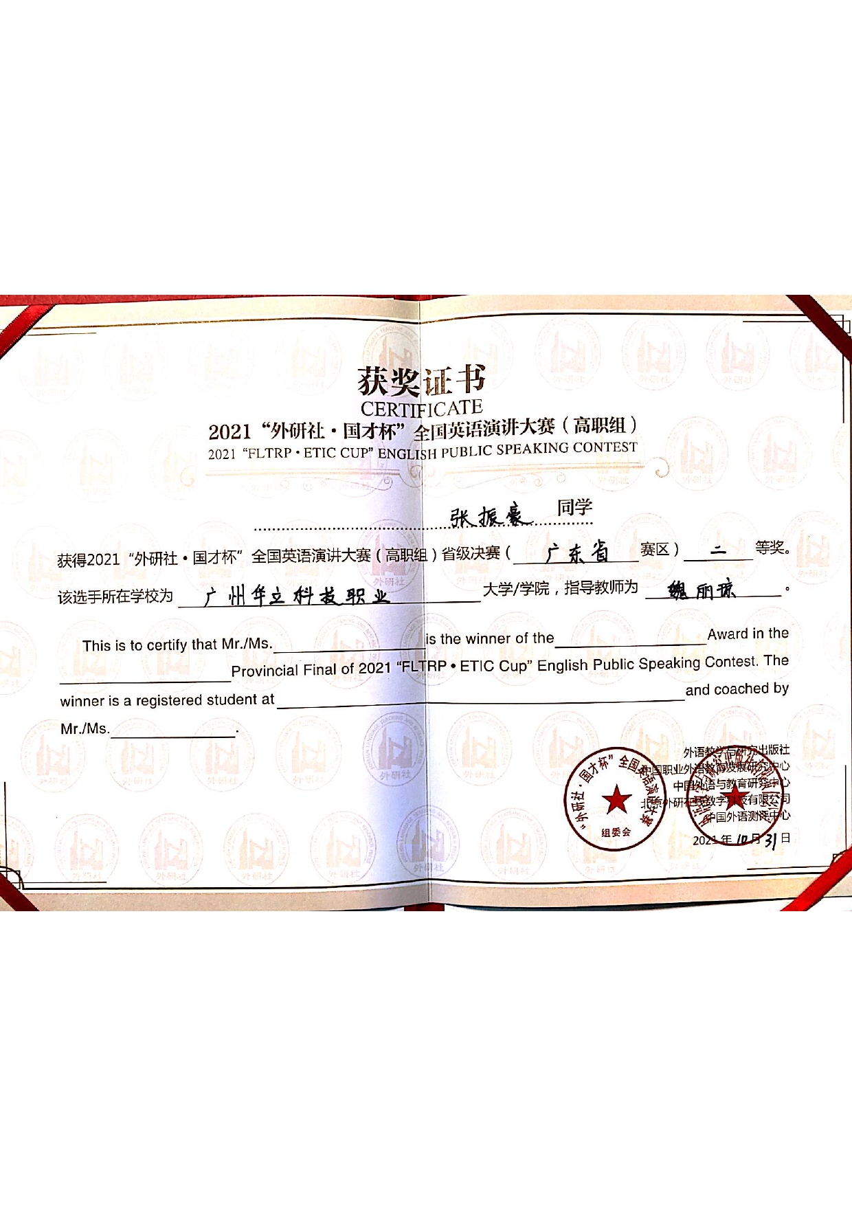 張振豪同學獲2021“外研社·國才杯”全國英語演講大賽(高職組)省級決賽(廣東賽區(qū))二等獎