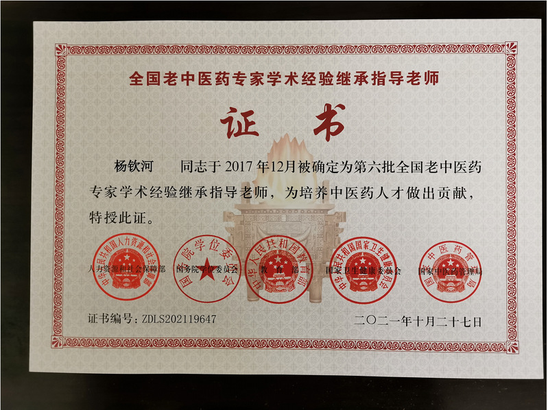 近日,我校中醫(yī)藥學院院長楊欽河教授榮獲國家五部委聯(lián)合頒發(fā)的“第六批全國老中醫(yī)藥專家學術經(jīng)驗繼承指導老師”證書。這是我校首位獲得中醫(yī)藥類國家級榮譽的教師。楊教授多年來堅持教學、科研和臨床工作并重,為中醫(yī)藥人才培養(yǎng)作出了積極貢獻,已培養(yǎng)博士、碩士和博士后65名,學術傳承人2名;指導在讀博士生、碩士生17名,博士后6名,學術傳承人8名。先后主持包括6項國家自然科學基金面上項目等多項國家省部廳局級科研教學資助課題,在國內外發(fā)表學術論文200余篇,其中以第一或通訊作者發(fā)表SCI論文30余篇;獲廣東省科技進步二等獎1項(第一完成人)、三等獎和中醫(yī)藥科技進步一等獎各1項(第四完成人)。在臨床上擅長運用中醫(yī)藥、中西醫(yī)結合理論和方法診治慢性肝膽病、脂代謝病、胃腸疾病及呼吸道系統(tǒng)和泌尿系疾病等各科疑難病癥,是學驗具豐的老中醫(yī)藥專家。