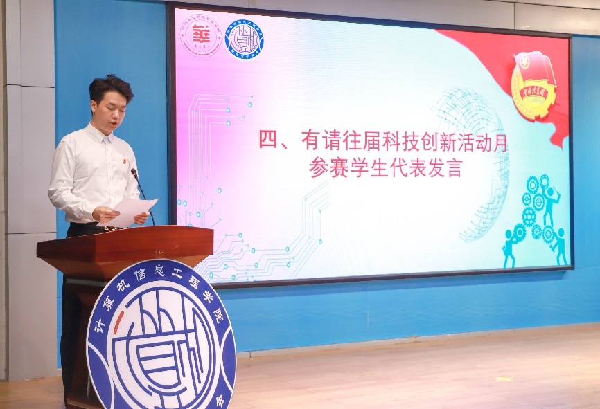 最后由往屆科技創(chuàng)新活動(dòng)月參賽學(xué)生蘇洲同學(xué)代表發(fā)言,蘇洲同學(xué)分享了參加第一屆“數(shù)據(jù)引擎,智馭未來(lái)”科技創(chuàng)新活動(dòng)月系列活動(dòng)的心得,鼓勵(lì)大家積極參與,并預(yù)祝本屆“賡續(xù)百年榮光,勇攀科創(chuàng)高峰”科技創(chuàng)新活動(dòng)月取得圓滿成功!