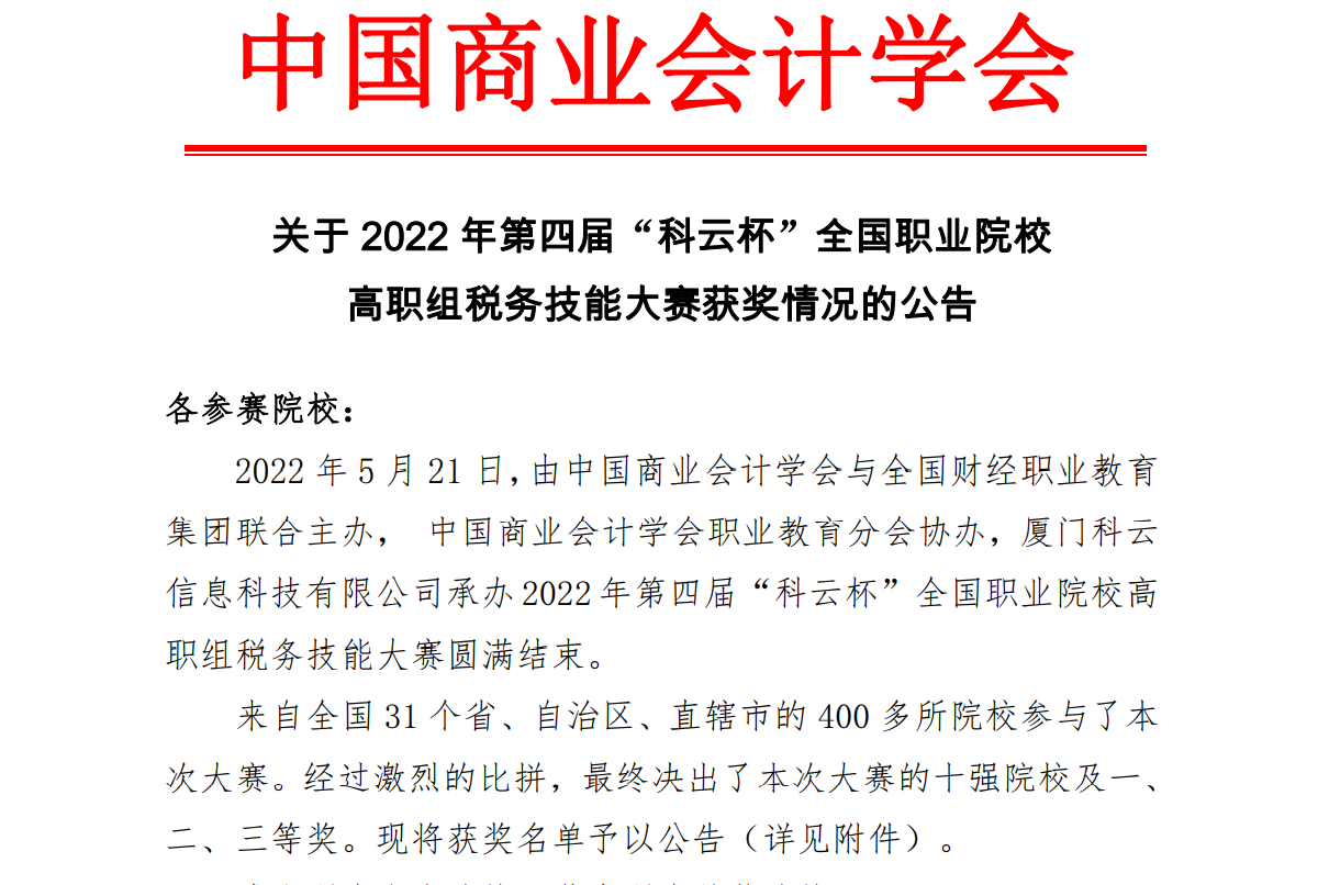 2022年5月21日,由中國商業(yè)會計學(xué)會、全國財經(jīng)職業(yè)教育集團主辦的2022年第四屆“科云杯”全國職業(yè)院校高職組稅務(wù)技能大賽在云端成功舉辦。本屆大賽歷時2個多月,全國400多所院校共590多支隊伍報名參賽。