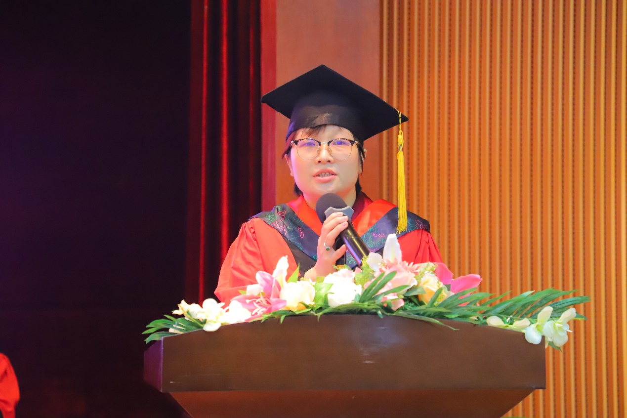 藝術(shù)與傳媒學(xué)院梁寶怡同學(xué)代表2022屆全體畢業(yè)生進(jìn)行發(fā)言。她說到,感謝學(xué)校的悉心栽培,為同學(xué)們的發(fā)展提供的諸多平臺和展示的機(jī)會,讓自己在大學(xué)三年里得到了全方面的成長。表示自己會一直銘記“厚德 強(qiáng)能 務(wù)實 創(chuàng)新”的校訓(xùn),并身體力行。青春激昂的發(fā)言贏得了現(xiàn)場雷鳴般的掌聲。