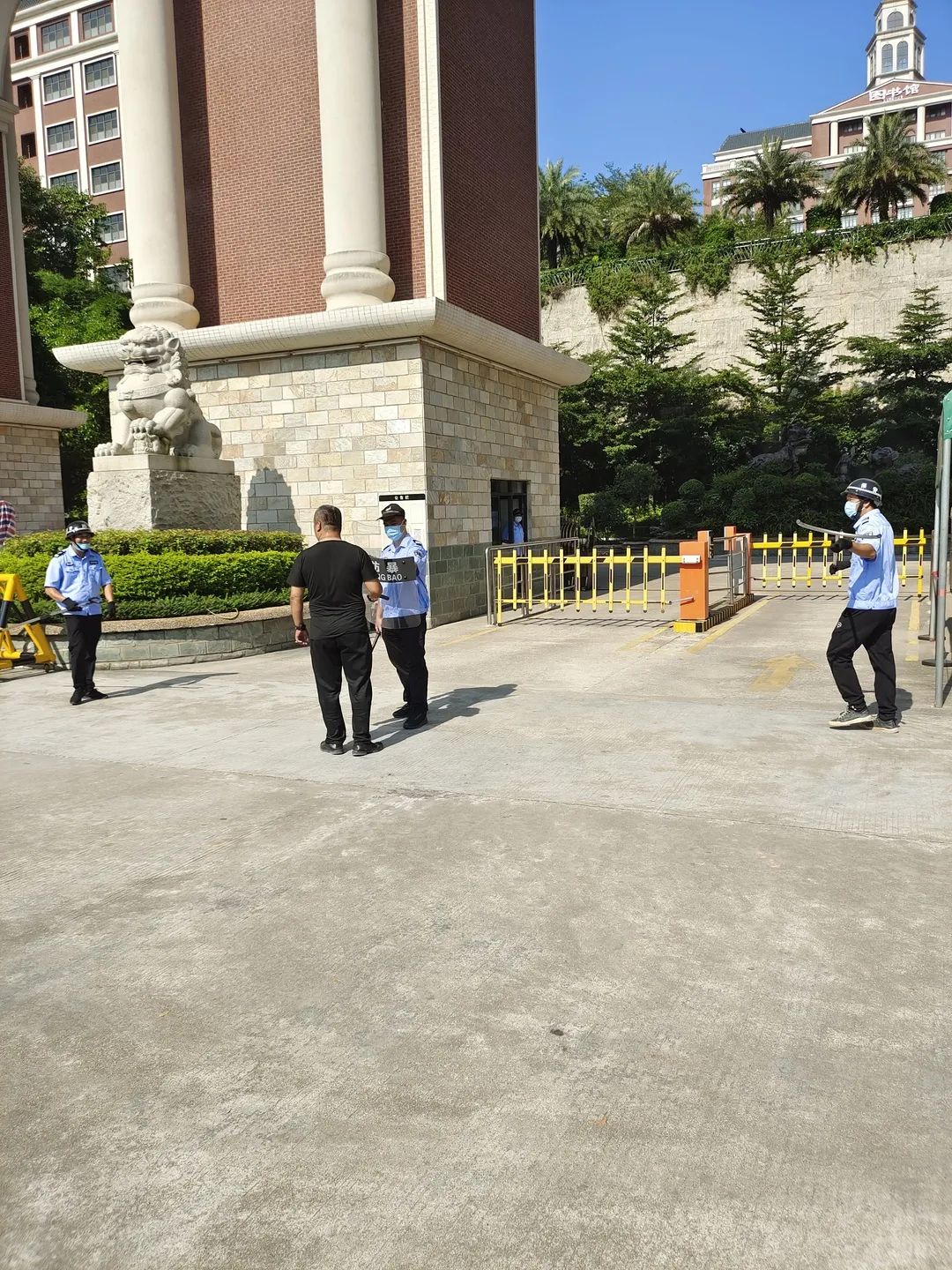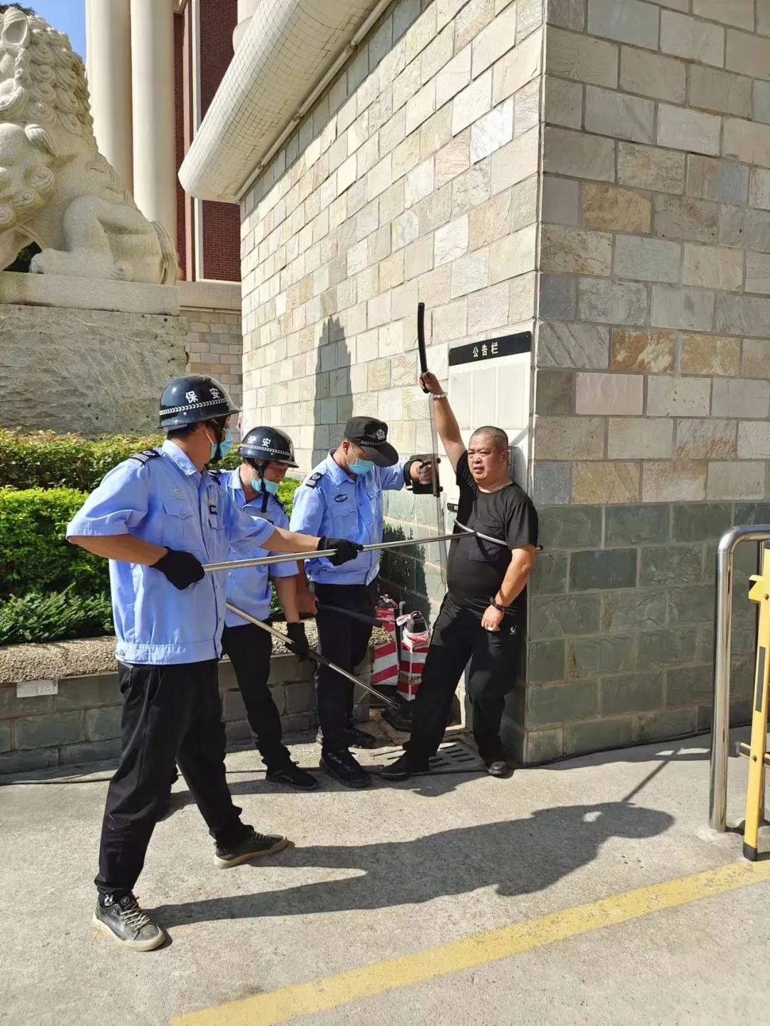 8月23日上午9時,一名扮演“歹徒”的工作人員試圖闖入校園,對師生安全造成了威脅。校園安保人員發(fā)現(xiàn)“歹徒”硬闖校園,一名安保馬上一鍵報(bào)警,并立刻打電話給校領(lǐng)導(dǎo)派人到現(xiàn)場協(xié)助安保人員將其制服,然后馬上回到站位,與另外兩名安保一同抵御。安保人員手持腳叉、鋼叉、防暴盾等防暴工具,把“歹徒”壓制到角落或者地上,奪取兇徒武器交由于警方、保護(hù)現(xiàn)場,并立刻回到崗位,做好上報(bào)指示。