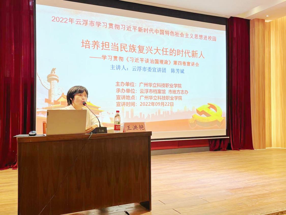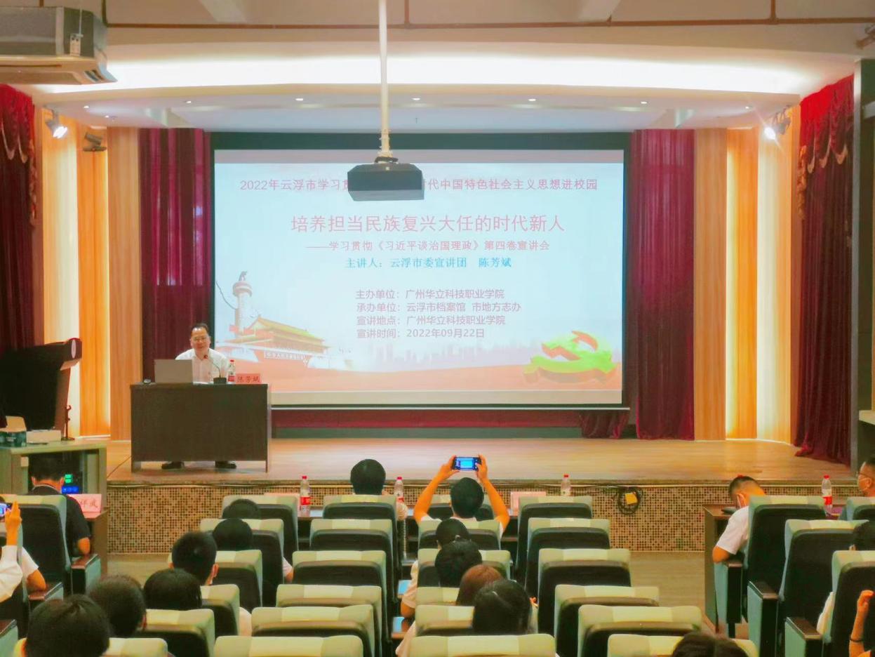 教育興則國(guó)家興,教育強(qiáng)則國(guó)家強(qiáng)。培養(yǎng)什么樣的人、如何培養(yǎng)人以及為誰(shuí)培養(yǎng)人,一直是習(xí)近平總書(shū)記強(qiáng)調(diào)的重中之重。為了推動(dòng)廣大師生進(jìn)一步增強(qiáng)學(xué)思想、悟思想、用思想的自覺(jué)性與堅(jiān)定性;不斷提高政治判斷力、政治領(lǐng)悟力、政治執(zhí)行力。9月22日,廣州華立科技職業(yè)學(xué)院云浮校區(qū)特邀云浮市檔案館館長(zhǎng)、云浮市人民政府地方志辦公室主任、云浮市委宣講團(tuán)成員陳芳斌來(lái)校開(kāi)展學(xué)習(xí)貫徹《習(xí)近平談治國(guó)理政》第四卷專題報(bào)告會(huì)。