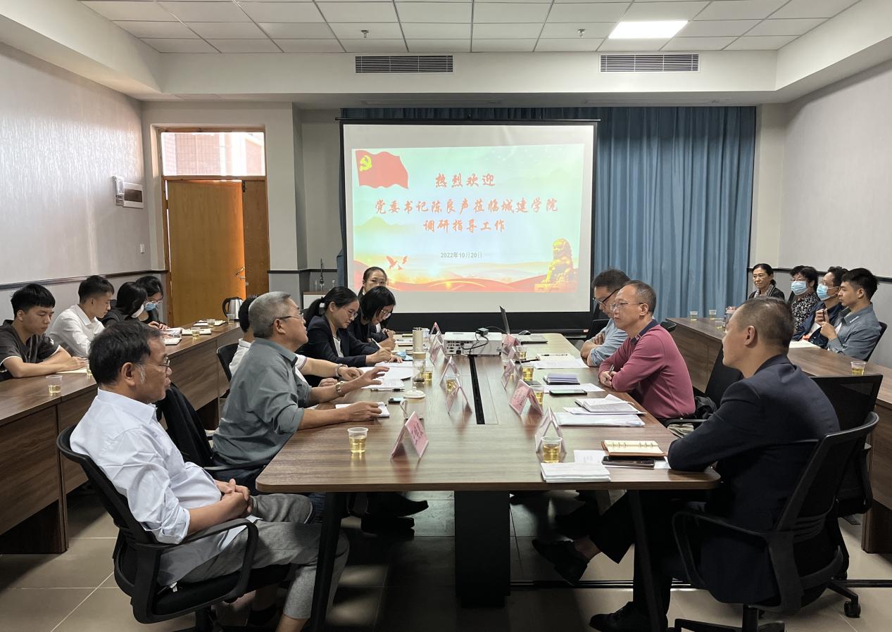 2022年10月20日下午,學(xué)校黨委書記陳良聲到城建學(xué)院、教育學(xué)院調(diào)研指導(dǎo)工作,黨委辦公室副主任孟允煌、云浮校區(qū)黨總支副書記蘇秦、團(tuán)委副書記李同同陪同調(diào)研。城建學(xué)院院長陳積光、教育學(xué)院院長馬岳良、城建學(xué)院黨總支書記李桂林及部分教師參加了調(diào)研活動。
