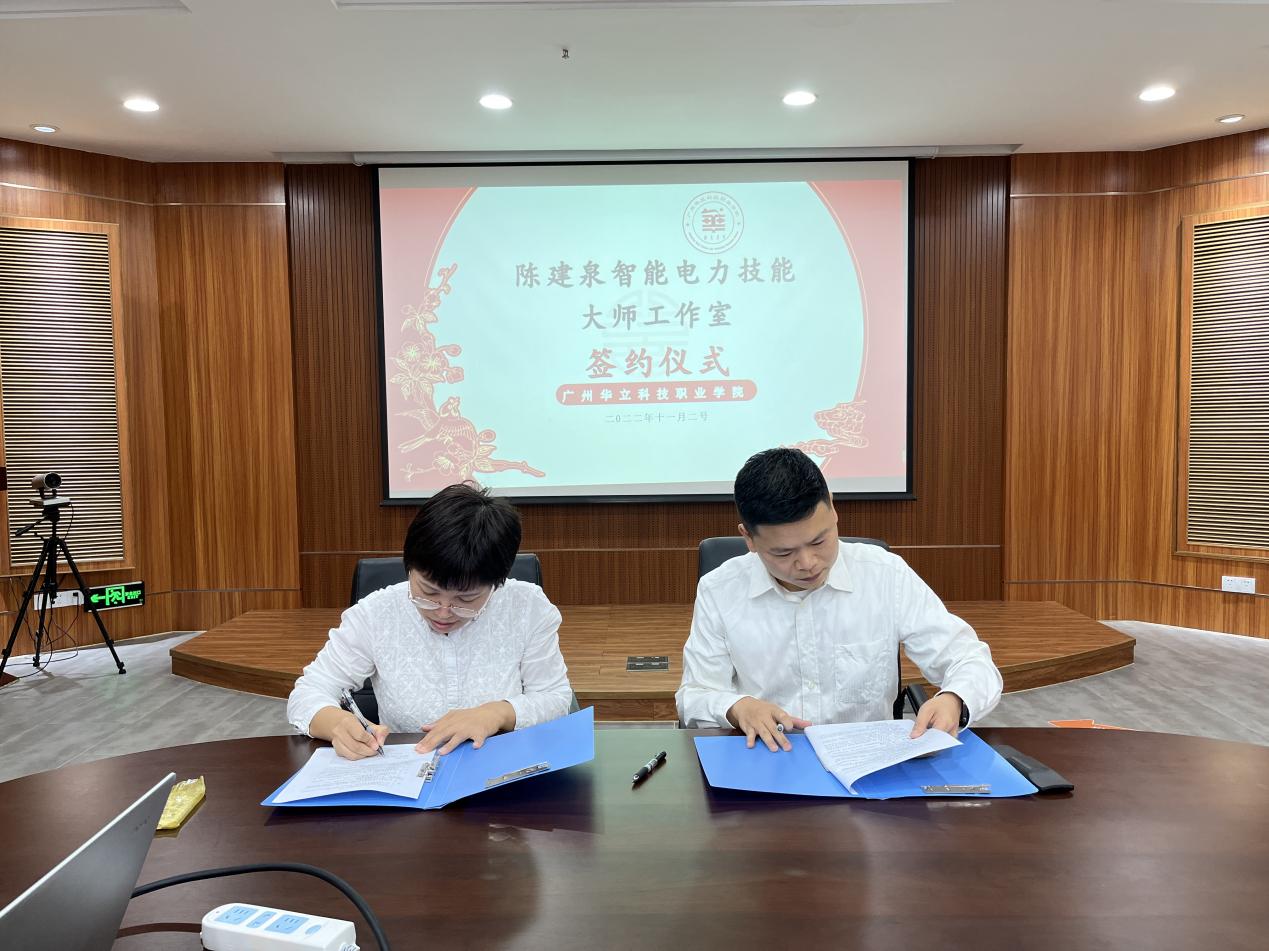 (王洪艷副校長(zhǎng)與陳建泉進(jìn)行智能電力技能大師工作室簽約儀式)
