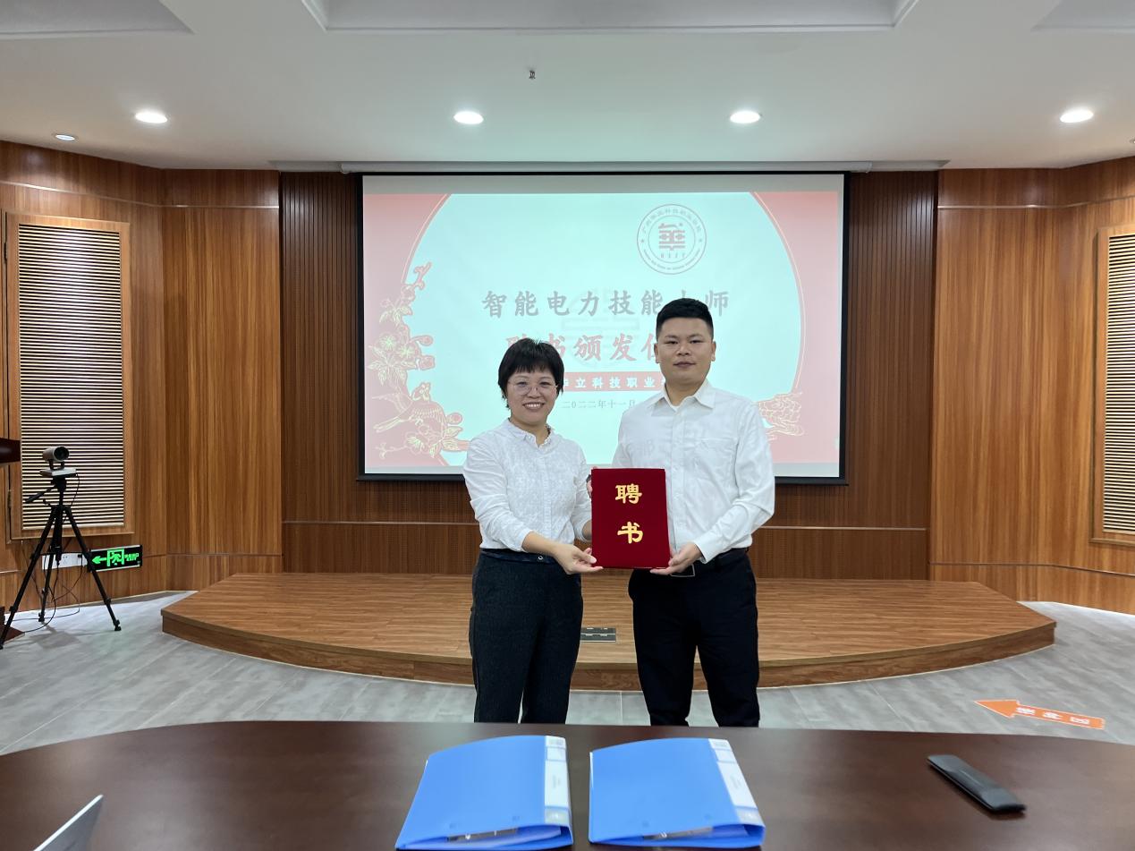 (王洪艷副校長(zhǎng)給陳建泉頒發(fā)智能電力技能大師聘書)