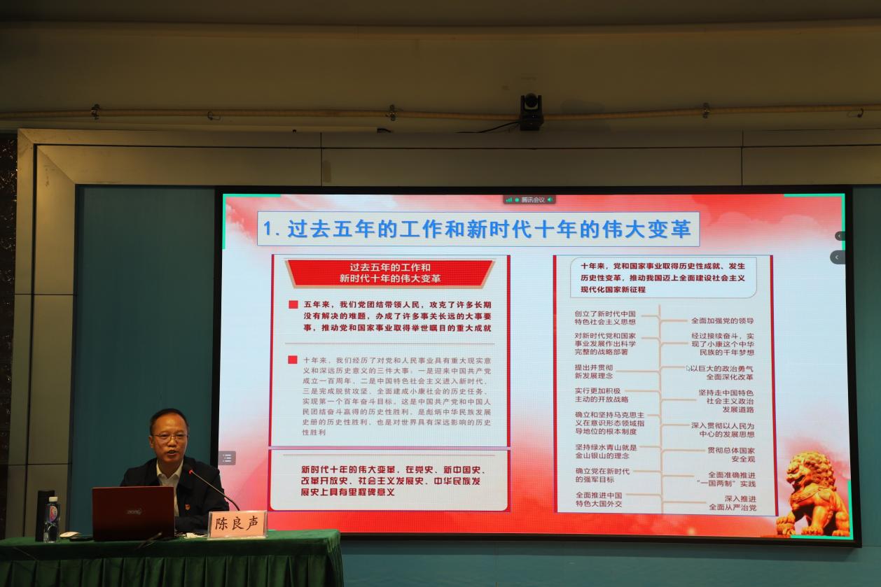 中國共產(chǎn)黨第二十次全國代表大會(huì)于今年10月16日至22日在北京舉行。為在我校迅速掀起學(xué)習(xí)宣傳貫徹黨的二十大精神的熱潮,11月2日下午,我校黨委理論學(xué)習(xí)中心組(擴(kuò)大)在圖書館104舉行學(xué)習(xí)會(huì),由學(xué)校黨委書記陳良聲進(jìn)行領(lǐng)學(xué)。