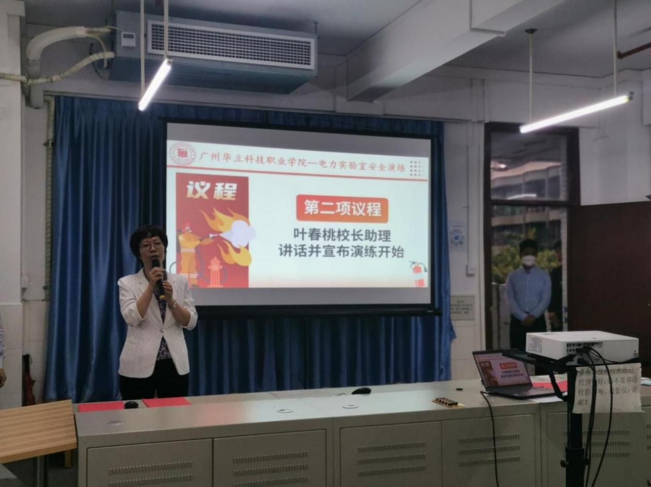 演練前,保衛(wèi)處、實訓(xùn)中心、電力與智能制造學(xué)院結(jié)合學(xué)校實驗室實際,制定周密詳細(xì)的演練方案,提前部署、人員及任務(wù)安排等準(zhǔn)備工作,做到有組織、有防范措施,嚴(yán)格按照實驗室安全工作管理規(guī)范做好現(xiàn)場防護和應(yīng)急處置。校長助理葉春桃首先作演練前的講話,強調(diào)實驗室安全演練的重要性,要按照流程做好本次演練的各項工作,提高應(yīng)急處置事故能力,最后宣布演練開始。
