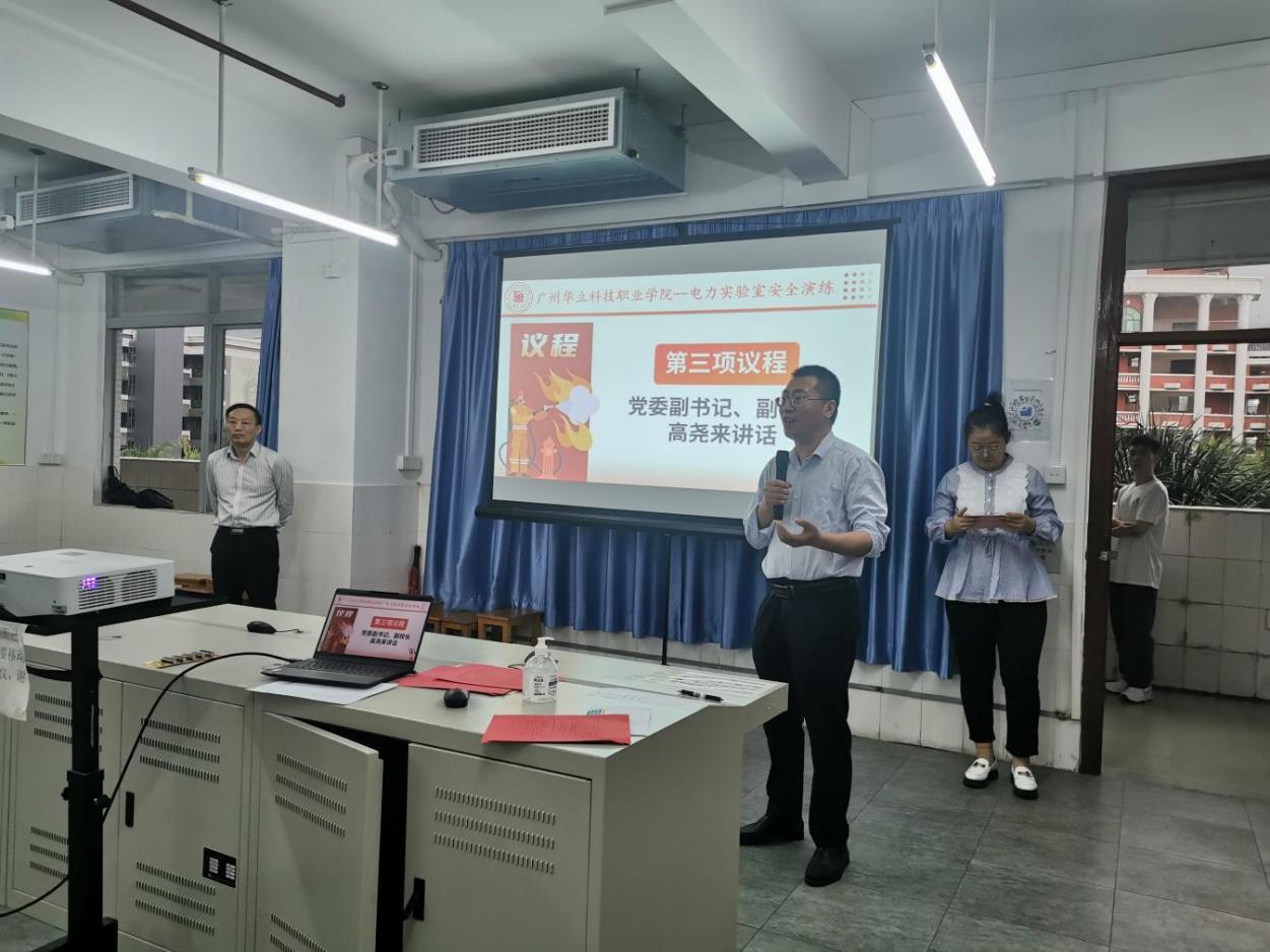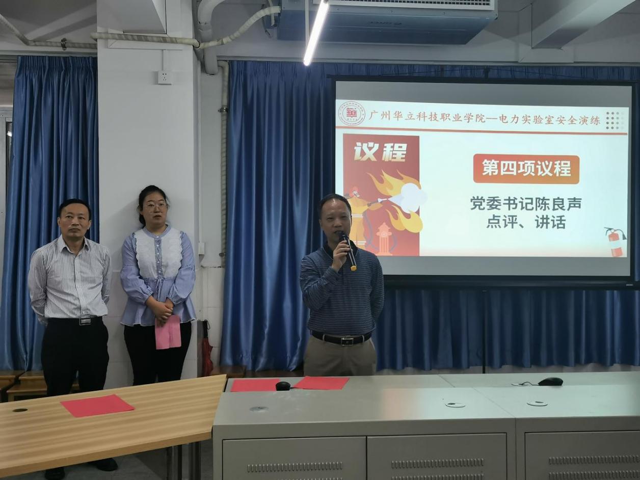 演練結(jié)束后,副校長高堯來強調(diào)實驗室安全工作是我們校園安全工作的一部分,要高度重視,以此次演練活動為契機,強化實驗室安全教育體系建設(shè),有針對性地進行實驗室安全演練和培訓(xùn)活動,有效預(yù)防和遏制實驗室事故的發(fā)生。接著由黨委書記陳良聲為此次電力實驗室安全演練作總結(jié),他認(rèn)為本次演練達(dá)到了預(yù)期效果,要切實加強校園安全,把安全穩(wěn)定作為最大的政治責(zé)任,妥善處理各種風(fēng)險隱患,并強調(diào)實驗室安全是校園安全的重要內(nèi)容,學(xué)校安全事關(guān)師生生命財產(chǎn)、事關(guān)家庭幸福安康、事關(guān)學(xué)??茖W(xué)發(fā)展、事關(guān)社會和諧穩(wěn)定、事關(guān)國家長治久安。他希望學(xué)校各部門、各單位樹立安全發(fā)展理念,弘揚生命至上、安全第一思想,努力做到人人講安全、事事為安全、時時想安全、處處要安全,凝神聚力建設(shè)更高水平的安全文明校園,共同為全校師生的學(xué)習(xí)工作生活、為學(xué)校的高質(zhì)量發(fā)展?fàn)I造平安祥和的校園環(huán)境。