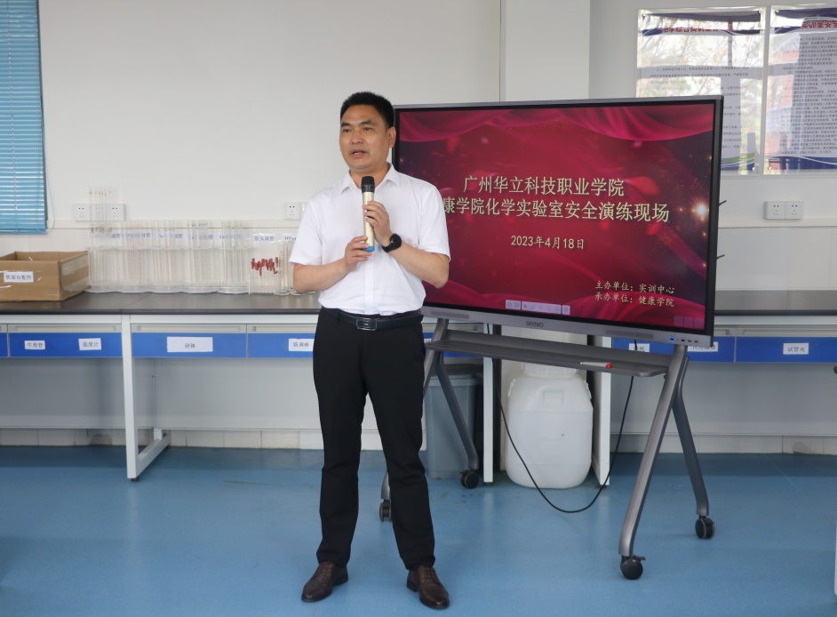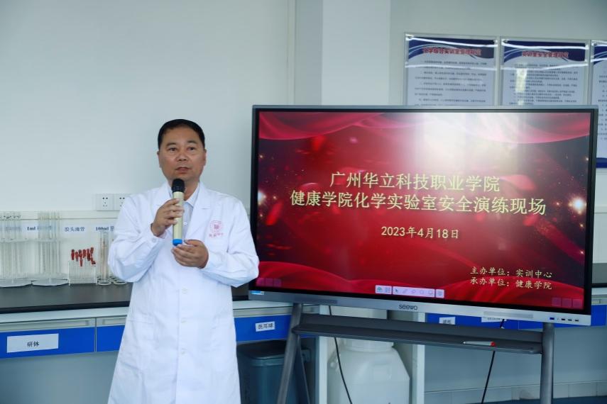 為認真貫徹落實《廣東省教育廳轉(zhuǎn)發(fā)教育部辦公廳關(guān)于印發(fā)《高等學(xué)校實驗室安全規(guī)范》的通知》的文件精神,切實提高師生實驗室安全意識,確保化學(xué)實驗室的安全性,提高學(xué)校實驗室突發(fā)事件的應(yīng)急處置能力。4月18日上午,由實訓(xùn)中心主辦,健康學(xué)院承辦的化學(xué)實驗室安全演練在西2-207室舉行。學(xué)校董事長助理李引章,黨委副書記、副校長高堯來,校長助理葉春桃,各二級學(xué)院(二級部門)負責(zé)人、實驗室負責(zé)人、實訓(xùn)中心、保衛(wèi)處、總務(wù)處、學(xué)生處、教務(wù)處及其他專業(yè)的教師代表和學(xué)生代表參加了本次演練,本次演練由健康學(xué)院許小玲老師和2021級藥學(xué)吳丹婷同學(xué)主持。