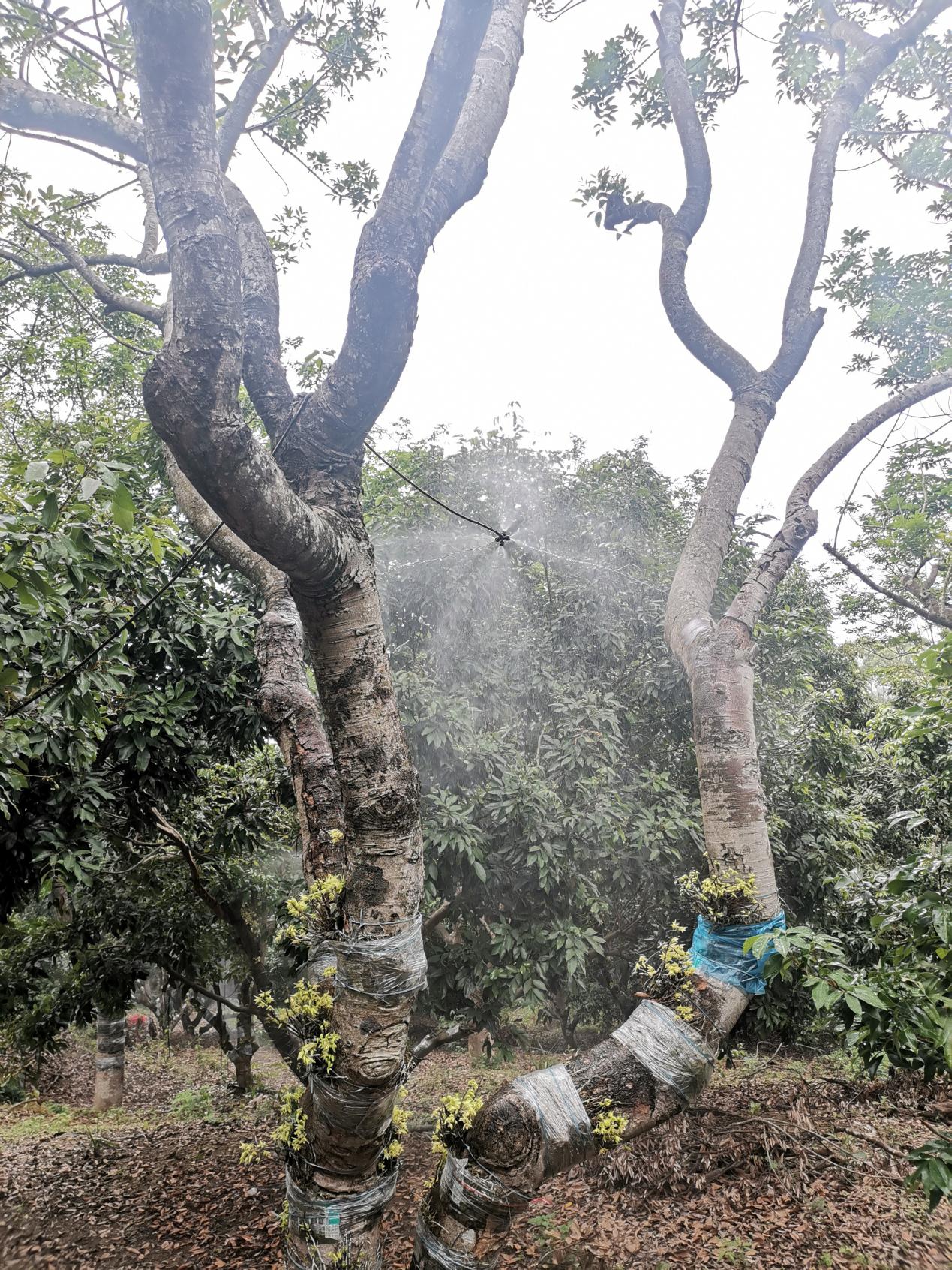 2022年4月,李向林教授科研團(tuán)隊(duì)與增城區(qū)荔城街道馬屋村四季常青農(nóng)業(yè)合作社開(kāi)展校企合作,利用該農(nóng)業(yè)合作社所屬的30畝荔枝果園共建鐵皮石斛仿野生種植示范基地。今年伊始,李向林教授科研團(tuán)隊(duì)幫助指導(dǎo)馬屋村鐵皮石斛種植基地安裝了噴霧灌溉裝置,這不僅改變了人工噴水費(fèi)時(shí)費(fèi)工的問(wèn)題,而且便于科學(xué)調(diào)節(jié)濕度,有利于鐵皮石斛的生長(zhǎng)。目前,李教授科研團(tuán)隊(duì)還嘗試將石斛種在烏欖樹(shù)上,現(xiàn)已取得初步成功。