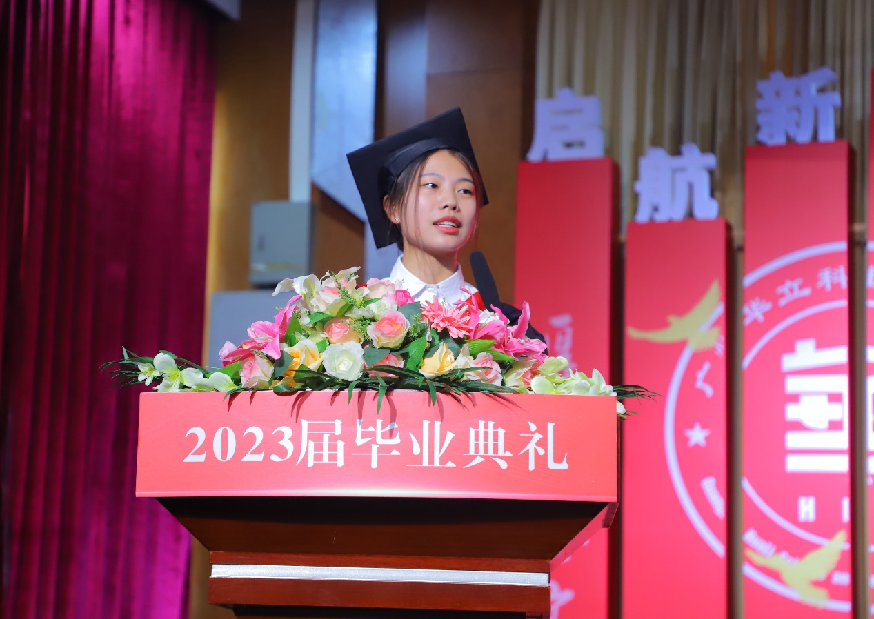 教育學(xué)院的謝梓婷同學(xué)代表2023屆全體畢業(yè)生進(jìn)行發(fā)言。她說(shuō)到,感謝學(xué)校的悉心栽培,母校生活不只豐富了我們的知識(shí),提升了我們的技能,更磨煉了我們的意志。感恩母校給予我們一個(gè)又一個(gè)登高望遠(yuǎn)的階梯,讓我們有能力有底氣站到更高的舞臺(tái),不斷成長(zhǎng)。表示自己會(huì)一直銘記“厚德 強(qiáng)能 務(wù)實(shí) 創(chuàng)新”的校訓(xùn),并身體力行。經(jīng)濟(jì)管理學(xué)院畢業(yè)生代婷婷發(fā)言時(shí)回顧自己大學(xué)三年的學(xué)習(xí)生活。她表示,要用行動(dòng)和奮斗書(shū)寫(xiě)屬于新時(shí)代華立人的多彩篇章。