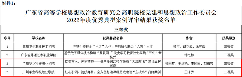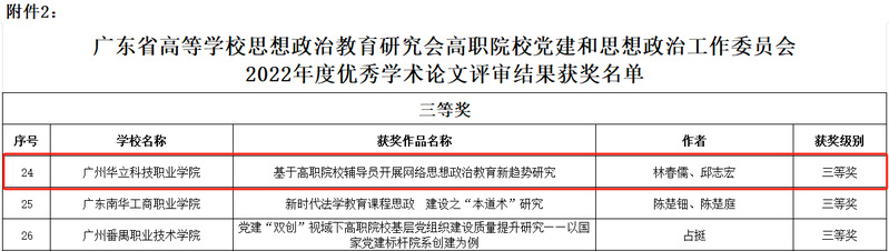 根據(jù)廣東省高等學(xué)校思想政治教育研究會、高職院校黨建和思想政治工作委員會《關(guān)于開展廣東省高職院校黨建和思想政治工作優(yōu)秀案例和學(xué)術(shù)論文征集評選活動的通知》要求,為進(jìn)一步學(xué)習(xí)貫徹習(xí)近平新時(shí)代中國特色社會主義思想和黨的二十大精神,提升學(xué)校黨建和思想政治工作質(zhì)量,推動新時(shí)代黨建和思想政治工作守正出新,學(xué)校黨委辦公室、黨委宣傳部、馬克思主義學(xué)院認(rèn)真組織開展黨建和思想政治工作優(yōu)秀案例和學(xué)術(shù)論文征集活動,各二級黨組織廣泛發(fā)動、積極參與,學(xué)校擇優(yōu)推薦上報(bào)的2篇案例、1篇論文均獲獎。其中王澤秀撰寫的案例《紅心引領(lǐng)、德技并修,全方位打造課思政建設(shè)“主戰(zhàn)場”品牌案例》、梁國英等同志撰寫的案例《以史育人,傳承精神——情景浸潤式校館聯(lián)動“大思政課”建設(shè)品牌案例》榮獲優(yōu)秀典型案例三等獎,林春儒、邱志宏撰寫的學(xué)術(shù)論文《基于高職院校輔導(dǎo)員開展網(wǎng)絡(luò)思想政治教育新趨勢研究》榮獲優(yōu)秀學(xué)術(shù)論文三等獎。