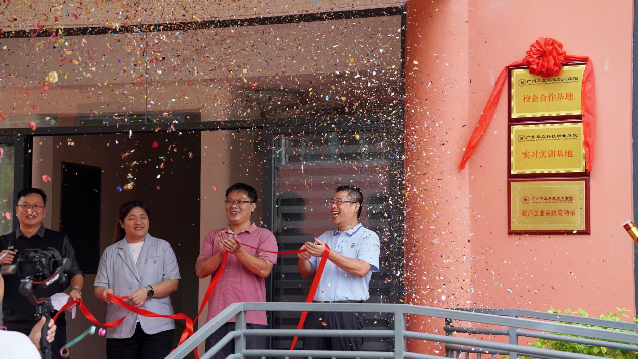 在師生們的見證下,學(xué)校陳顯強副校長、產(chǎn)教融合辦韋建林副主任、教育學(xué)院朱君副院長及華立獅寶寶黎瓔慧教學(xué)主任共同為廣州華立獅寶寶幼稚園“校企合作基地”、“實習(xí)實訓(xùn)基地”與“教師企業(yè)實踐流動站”揭牌。
