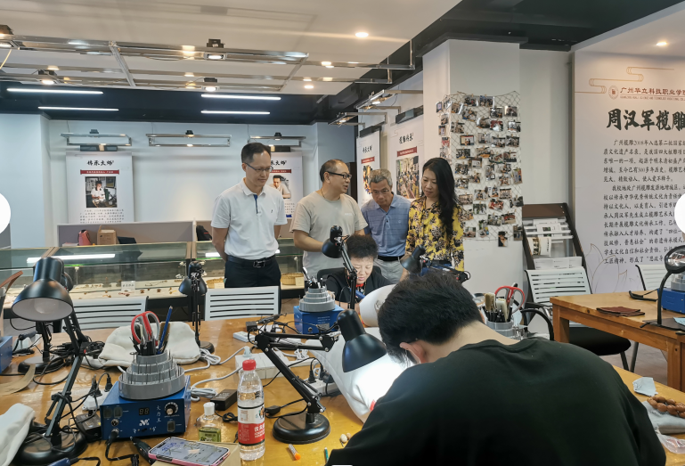 在欖雕基地,評(píng)建辦李艷華主任介紹了我?!皬V州欖雕”基地項(xiàng)目在2022年獲批廣東省高校第四批中華優(yōu)秀傳統(tǒng)文化傳承基地立項(xiàng)建設(shè),基地在人才培養(yǎng)、課程建設(shè)和科研方面成果豐碩。“廣州欖雕”代表性傳承人周漢軍大師介紹了工作室的情況,工作室自成立以來以欖雕技藝傳承為載體,將欖雕文化傳承融入人才培養(yǎng),已培養(yǎng)青年傳承骨干30余人,團(tuán)隊(duì)設(shè)計(jì)開發(fā)欖雕文創(chuàng)作品100余件。湯麗玲主席對(duì)欖雕基地高度贊同,希望學(xué)校和周大師繼續(xù)將增城傳統(tǒng)文化發(fā)揚(yáng)光大,讓更多人接觸這項(xiàng)技藝。
