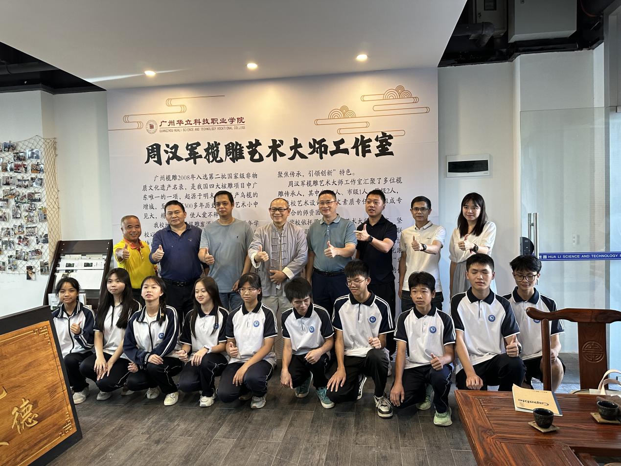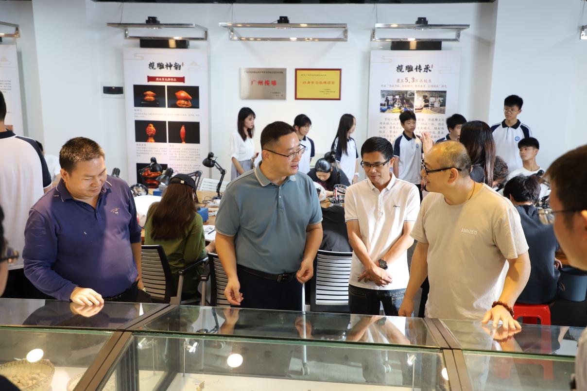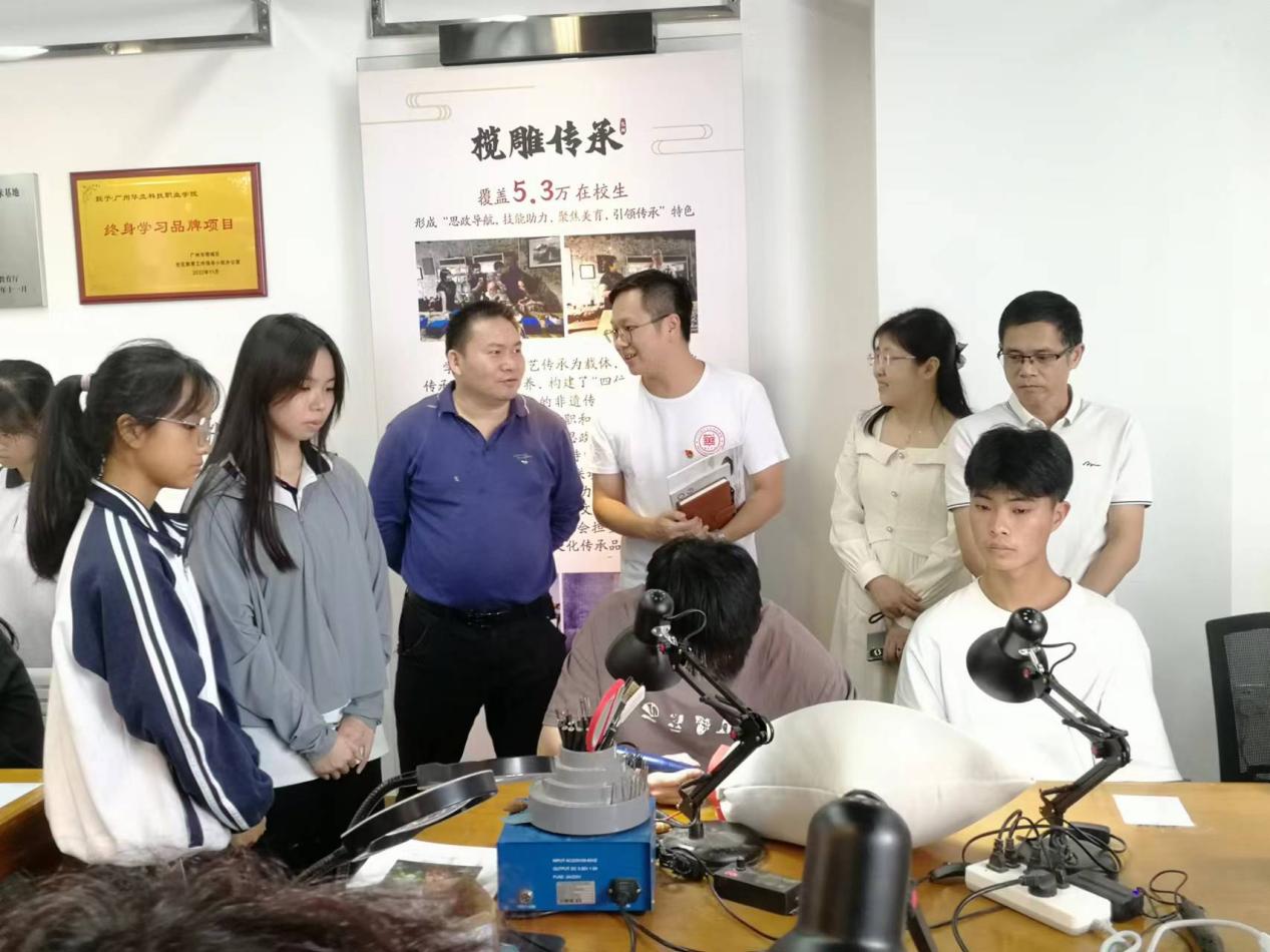 座談會后,黃勁勇副局長一行和增城區(qū)廣播電視大學(xué)師生一起到我校廣州欖雕中華優(yōu)秀傳統(tǒng)文化基地進行實地考察,與基地教師和學(xué)生進行了交流,深入了解基地欖雕教學(xué)開展情況,并對非遺進校園建設(shè)的細節(jié)提出了建設(shè)性意見。