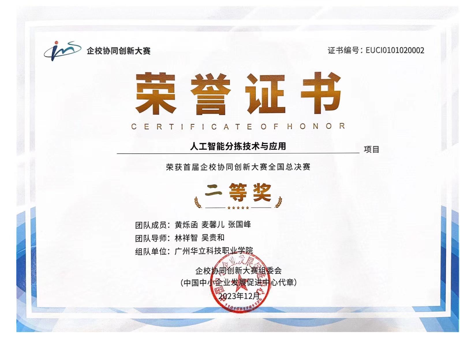 本次大賽自今年7月份啟動以來,共吸引了來自劍橋大學、哈爾濱工業(yè)大學、復旦大學、華北電力大學、北京航空航天大學、蘇州大學、電子科技大學、廈門大學等國內外近400所院校、1700余支隊伍、超過7000人參賽。我校的參賽隊由電力與智能制造學院的林祥智老師與廣州銀變電力設備有限公司吳貴和副總經(jīng)理指導,電力與智能制造學院的黃爍函和計算機信息工程學院的麥馨兒、張國峰三位同學組成,經(jīng)過賽前的刻苦訓練和賽中的頑強拼搏,最終獲得首屆全國企校協(xié)同創(chuàng)新大賽總決賽“二等獎”的榮譽,林祥智老師獲得“優(yōu)秀指導教師”稱號,我校獲得“優(yōu)秀組織單位”稱號。