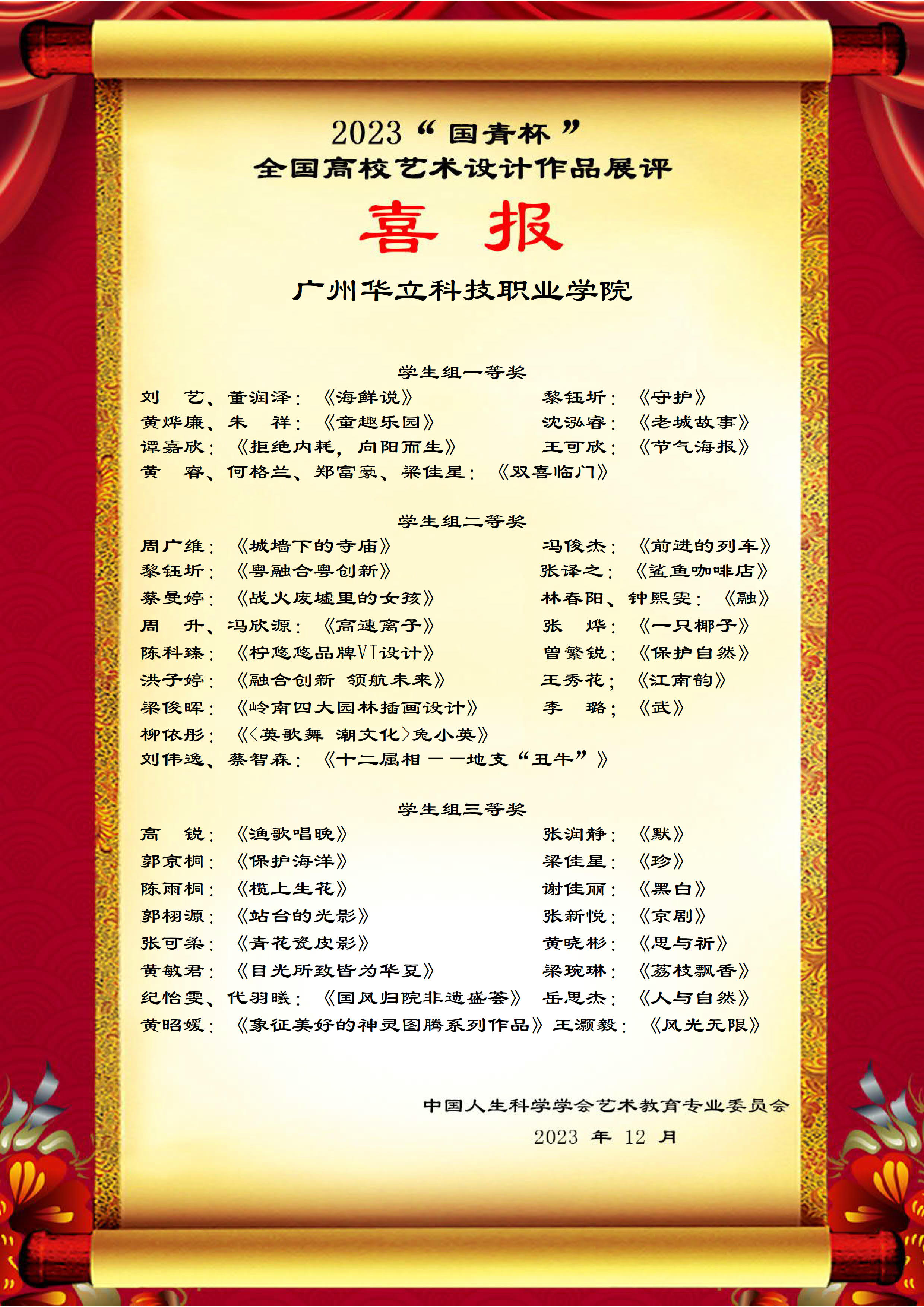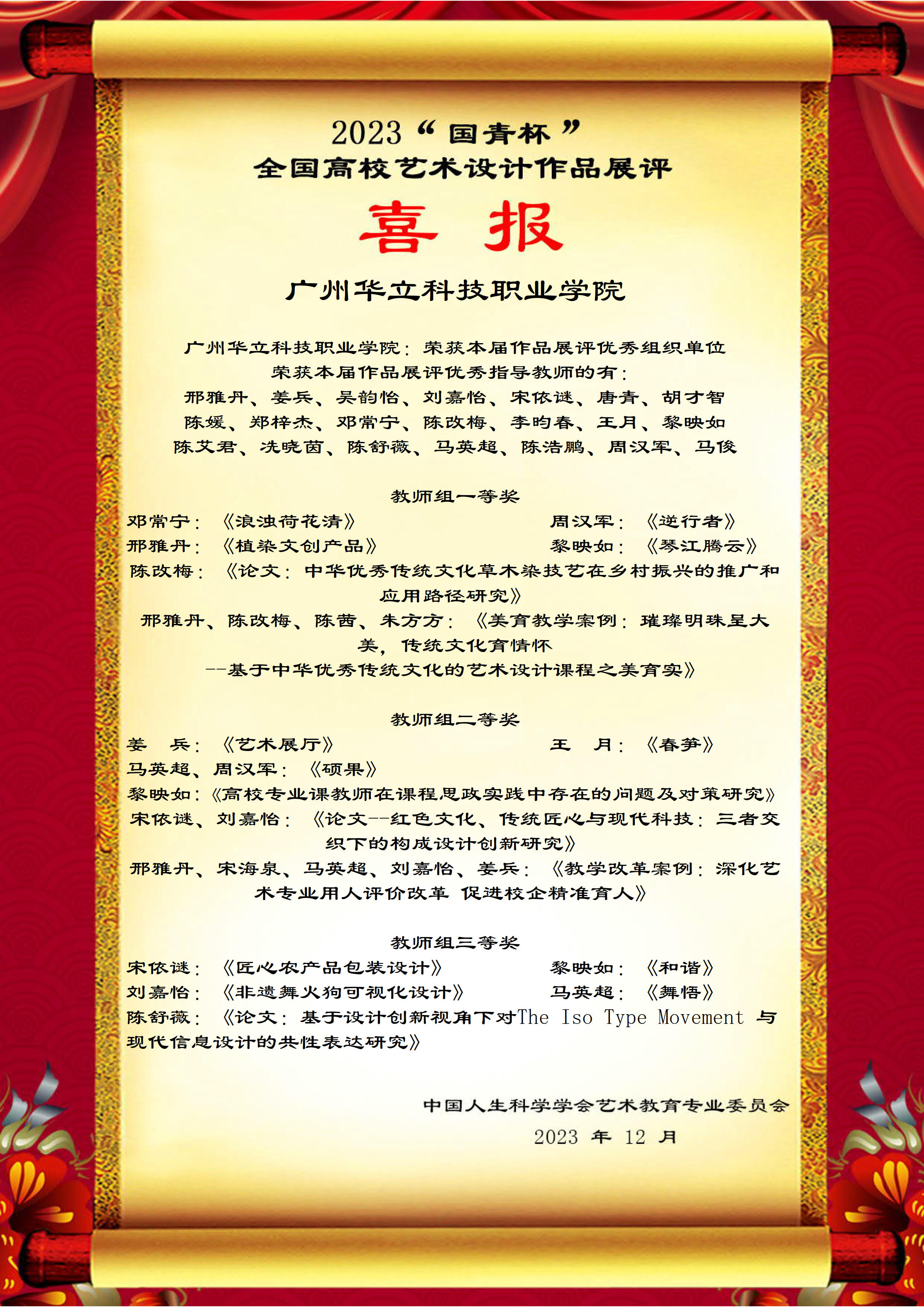 基于此,中國(guó)人生科學(xué)學(xué)會(huì)藝術(shù)教育專業(yè)委員會(huì)授予廣州華立科技職業(yè)學(xué)院為本屆作品展評(píng)優(yōu)秀組織單位;授予馬俊、周漢軍、陳改梅、邢雅丹、黎映如、劉嘉怡、姜兵、吳韻怡、宋依謎、唐青、胡才智、陳媛、鄭梓杰、鄧常寧、李昀春、王月、陳艾君、冼曉茵、陳舒薇、馬英超、陳浩鵬為本屆作品展評(píng)優(yōu)秀指導(dǎo)教師。