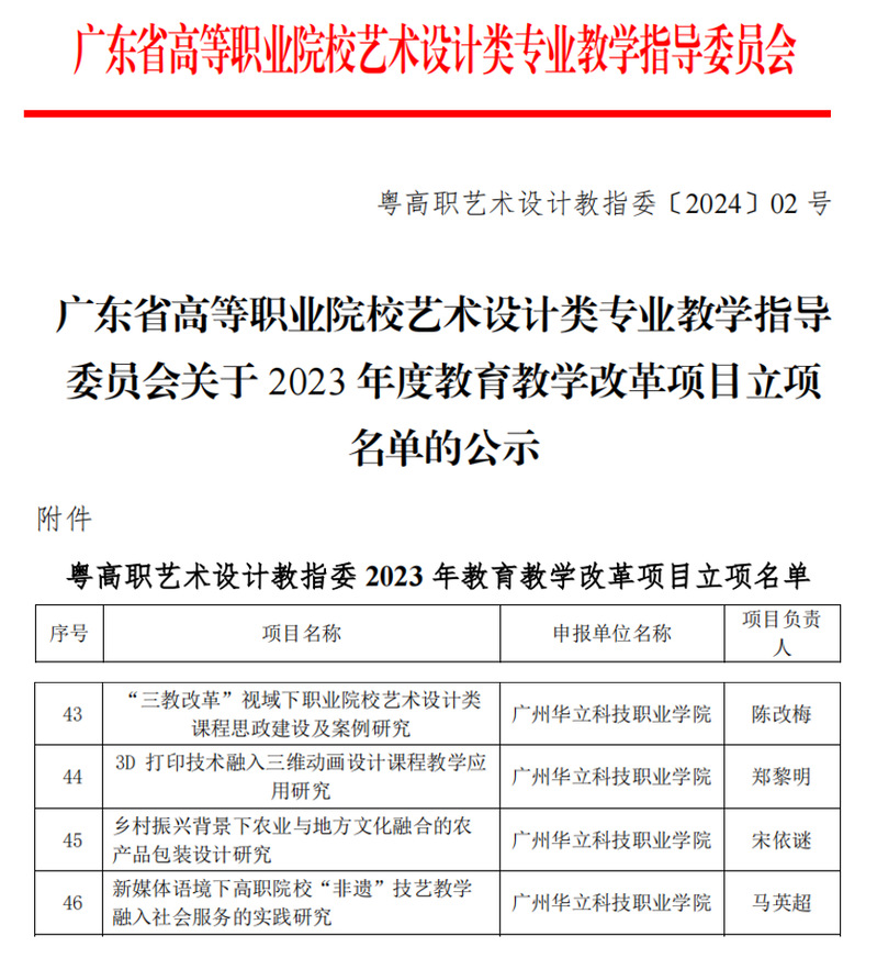 近日,廣東省高等職業(yè)院校藝術(shù)設(shè)計(jì)類專業(yè)教學(xué)指導(dǎo)委員會(huì)公布了2023年度教育教學(xué)改革項(xiàng)目立項(xiàng)結(jié)果。藝傳學(xué)院陳改梅、鄭黎明、宋依謎、馬英超老師的《“三教改革”視域下職業(yè)院校藝術(shù)設(shè)計(jì)類課程思政建設(shè)及案例研究》、《3D打印技術(shù)融入三維動(dòng)畫設(shè)計(jì)課程教學(xué)應(yīng)用研究》、《鄉(xiāng)村振興背景下農(nóng)業(yè)與地方文化融合的農(nóng)產(chǎn)品包裝設(shè)計(jì)研究》、《新媒體語境下高職院校“非遺”技藝教學(xué)融入社會(huì)服務(wù)的實(shí)踐研究》獲得立項(xiàng)。此次教學(xué)改革課題獲得立項(xiàng),是學(xué)校領(lǐng)導(dǎo)重視科研工作及藝傳學(xué)院教師積極參與藝術(shù)設(shè)計(jì)類專業(yè)教學(xué)改革的結(jié)果。