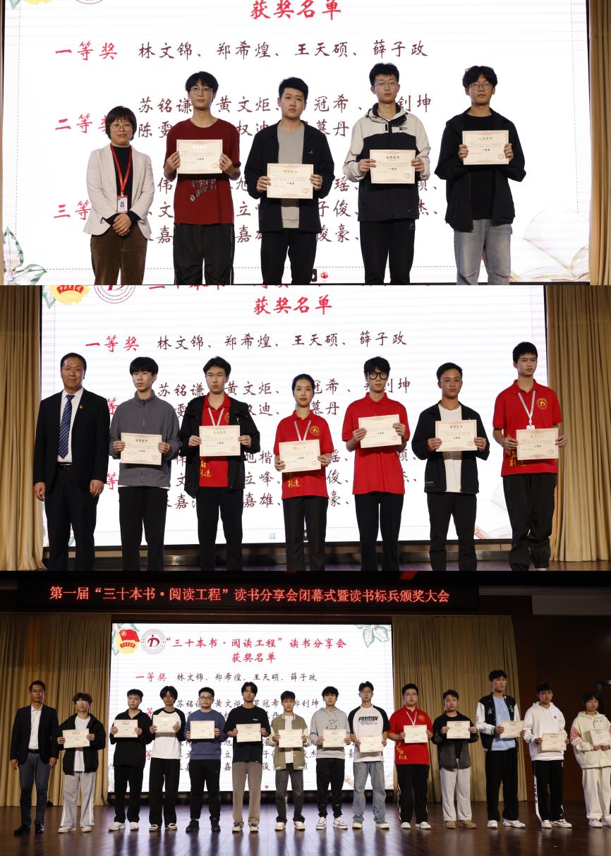讀書分享結束后,對獲得電力與智能制造學院第一屆“三十本書?閱讀工程”讀書分享一二三等獎的同學及獲得“讀書標兵”、“讀書之星”的同學進行了頒獎。