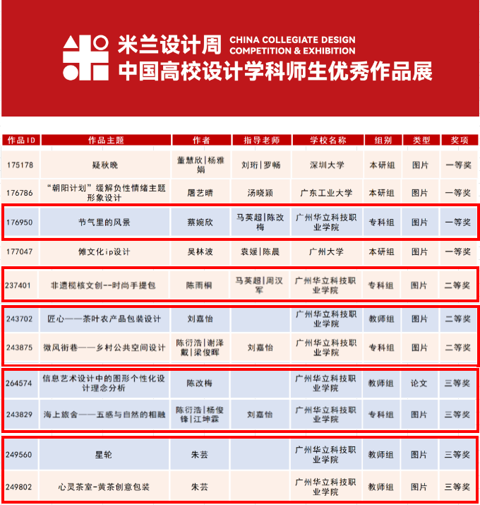 近日,由中國高等教育學(xué)會(huì)、中國教育國際交流協(xié)會(huì)主辦的“第八屆米蘭設(shè)計(jì)周-中國高校設(shè)計(jì)學(xué)科師生優(yōu)秀作品展”廣東賽區(qū)評(píng)選圓滿落幕。我校藝術(shù)與傳媒學(xué)院師生榮獲一等獎(jiǎng)1項(xiàng),二等獎(jiǎng)3項(xiàng),三等獎(jiǎng)4項(xiàng),(一、二等獎(jiǎng)作品晉級(jí)國賽)。