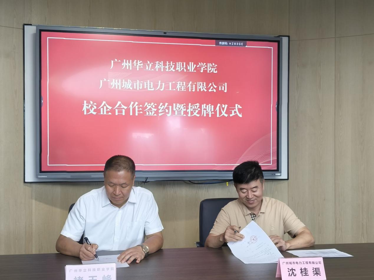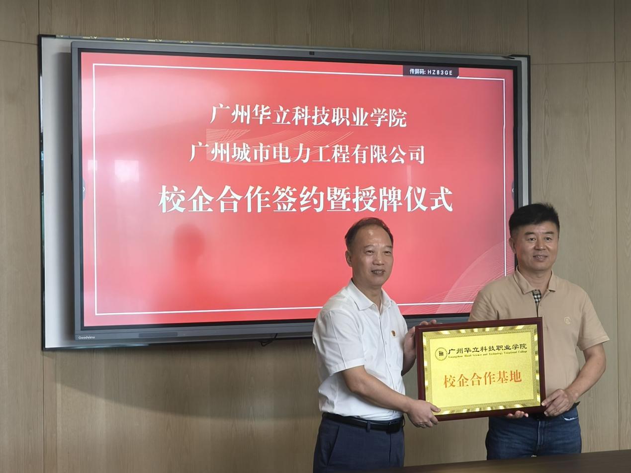 交流結(jié)束后,電力與智能制造學(xué)院院長(zhǎng)褚玉峰與廣州城市電力工程有限公司總裁沈桂渠續(xù)簽了校企合作協(xié)議書,陳良聲書記“校企合作基地”授牌。