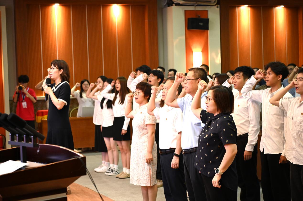 大會在莊嚴(yán)的國歌聲中拉開序幕,面對鮮紅的中國共產(chǎn)黨黨旗,黨委委員、校長助理葉春桃同志帶領(lǐng)新黨員莊嚴(yán)宣誓、老黨員重溫入黨誓詞。