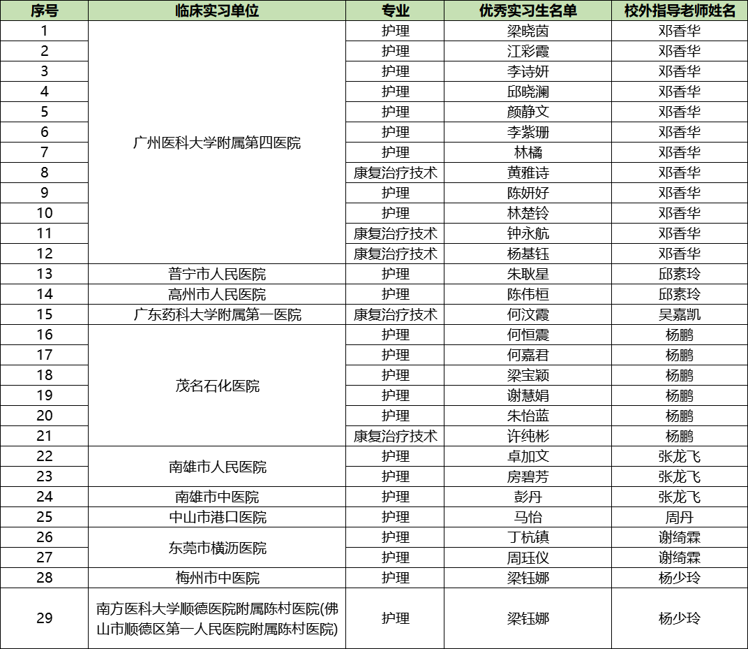 在此次實(shí)習(xí)中,健康學(xué)院的學(xué)生們憑借扎實(shí)的技能功底在同類院校的實(shí)習(xí)生中脫穎而出,現(xiàn)已有29名同學(xué)在廣州醫(yī)科大學(xué)附屬第四醫(yī)院、廣州藥科大學(xué)附屬第一醫(yī)院、梅州市中醫(yī)院、茂名石化醫(yī)院等多家二甲及以上綜合性教學(xué)醫(yī)院因操作規(guī)范、技術(shù)嫻熟、實(shí)習(xí)期間表現(xiàn)優(yōu)秀,獲評“優(yōu)秀實(shí)習(xí)生”。