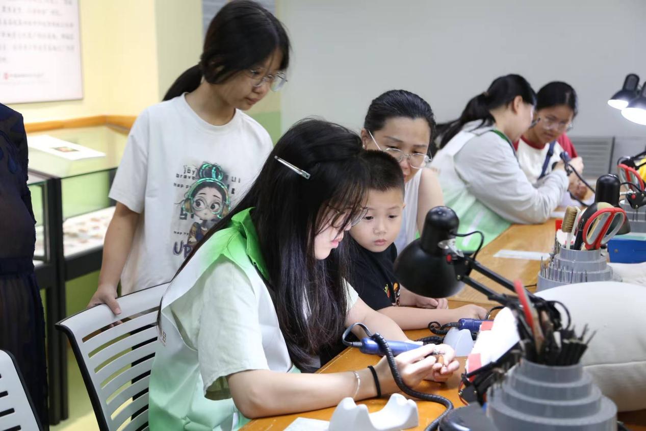 隨后,在師生志愿者的引導(dǎo)下,參觀人員了解認(rèn)識欖雕原材料,近距離觀摩匠人的雕刻技藝,并細(xì)細(xì)品味精美的欖雕作品。志愿者生動細(xì)致的講解,輔以沉浸式的互動體驗,使大家逐步領(lǐng)略到這項傳統(tǒng)技藝的藝術(shù)精髓與文化底蘊(yùn)。