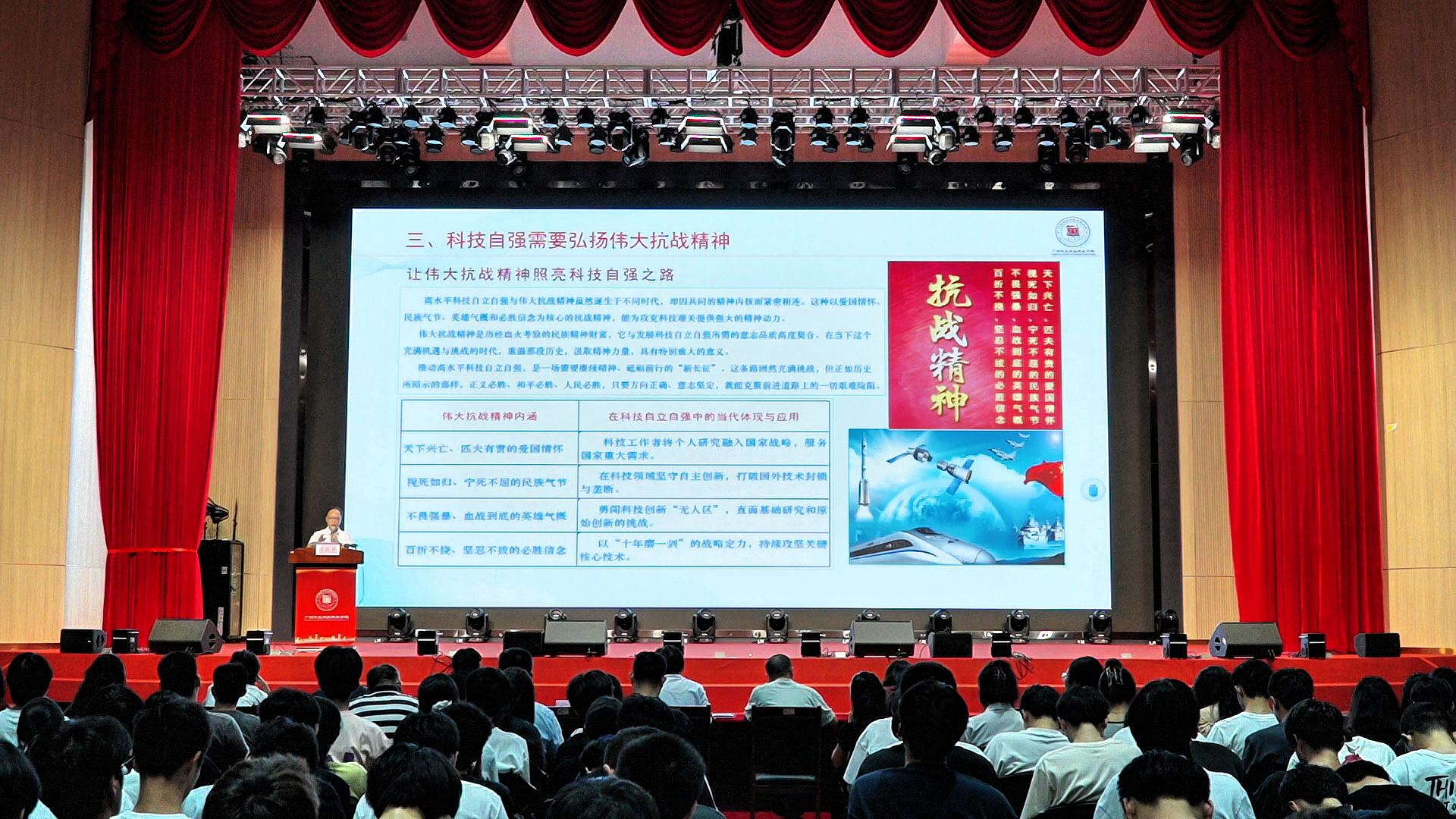 9月16日,廣州華立科技職業(yè)學(xué)院云浮校區(qū)文體樓8樓報(bào)告廳內(nèi)座無(wú)虛席,氣氛莊重而熱烈。學(xué)校黨委書記陳良聲同志以“傳承和弘揚(yáng)偉大抗戰(zhàn)精神,讓青春在實(shí)現(xiàn)高水平科技自立自強(qiáng)中綻放光芒”為題,圍繞“關(guān)于科技創(chuàng)新的重要論述、我國(guó)科技創(chuàng)新的當(dāng)代成就、科技自強(qiáng)需弘揚(yáng)抗戰(zhàn)精神、在科技自立中譜寫新華章”四個(gè)方面內(nèi)容,為2025級(jí)新生代表講授了一堂深刻而精彩的秋季學(xué)期“思政第一課”。這堂思政課不僅是一次思想的洗禮,更是一次奮進(jìn)的動(dòng)員,深刻闡述了偉大抗戰(zhàn)精神的時(shí)代價(jià)值,并將其與當(dāng)代青年學(xué)子的歷史使命、與國(guó)家實(shí)現(xiàn)高水平科技自立自強(qiáng)緊密相連。