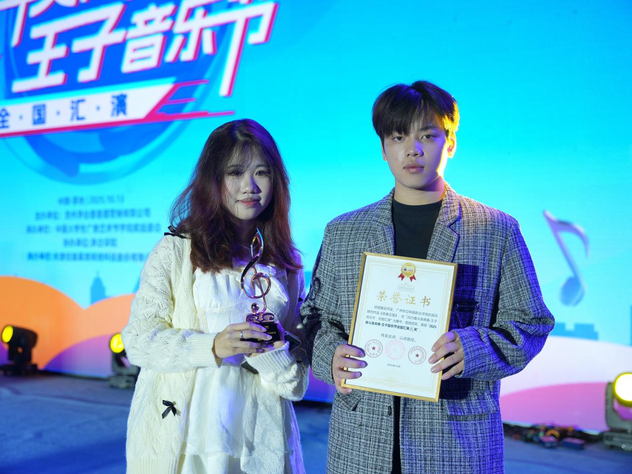 在當晚的匯演中,來自廣州華立科技職業(yè)學院、山東外事職業(yè)大學等10所高校的原創(chuàng)音樂團隊同臺競技,以多元化的音樂風格和青春激情,呈現(xiàn)了一場精彩紛呈的音樂盛宴。我校音樂團隊由學生關梓峰、張鋇鋇演繹的原創(chuàng)音樂作品《青春王國》,以獨特的音樂編排和富有感染力的舞臺表現(xiàn),展現(xiàn)了新時代青年對青春、夢想與奮斗的深刻理解。作品以充滿活力的旋律和積極向上的歌詞,傳遞出青春無畏、勇敢追夢的精神內核,贏得了現(xiàn)場觀眾的陣陣掌聲,并最終榮獲原創(chuàng)音樂作品銅獎,充分彰顯了我校學子的藝術才華與創(chuàng)新能力。