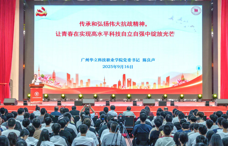 9月16日,廣州華立科技職業(yè)學(xué)院云浮校區(qū)文體樓8樓報(bào)告廳內(nèi)座無虛席,氣氛莊重而熱烈。學(xué)校黨委書記陳良聲同志以“傳承和弘揚(yáng)偉大抗戰(zhàn)精神,讓青春在實(shí)現(xiàn)高水平科技自立自強(qiáng)中綻放光芒”為題,圍繞“關(guān)于科技創(chuàng)新的重要論述、我國(guó)科技創(chuàng)新的當(dāng)代成就、科技自強(qiáng)需弘揚(yáng)抗戰(zhàn)精神、在科技自立中譜寫新華章”四個(gè)方面內(nèi)容,為2025級(jí)新生代表講授了一堂深刻而精彩的秋季學(xué)期“思政第一課”。這堂思政課不僅是一次思想的洗禮,更是一次奮進(jìn)的動(dòng)員,深刻闡述了偉大抗戰(zhàn)精神的時(shí)代價(jià)值,并將其與當(dāng)代青年學(xué)子的歷史使命、與國(guó)家實(shí)現(xiàn)高水平科技自立自強(qiáng)緊密相連。