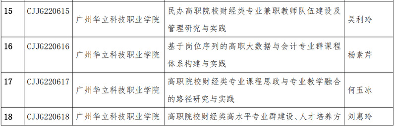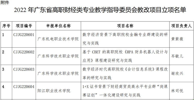 根據(jù)廣東省高等職業(yè)院校財(cái)經(jīng)類專業(yè)教學(xué)指導(dǎo)委員會(huì)發(fā)布的《關(guān)于組織申報(bào)2022年度財(cái)經(jīng)類專業(yè)教育教學(xué)改革項(xiàng)目的通知》(粵高職財(cái)經(jīng)教指委〔2022〕3號(hào))規(guī)定,給個(gè)人申報(bào)、學(xué)校推薦、資格審查、專家評審和公示等環(huán)節(jié),廣東省高職財(cái)經(jīng)類專業(yè)教學(xué)指導(dǎo)委員會(huì)共立項(xiàng)了39個(gè)教改項(xiàng)目,其中我校吳利玲、楊素芹、何玉冰、劉惠玲等4位教師的項(xiàng)目成功立項(xiàng)。