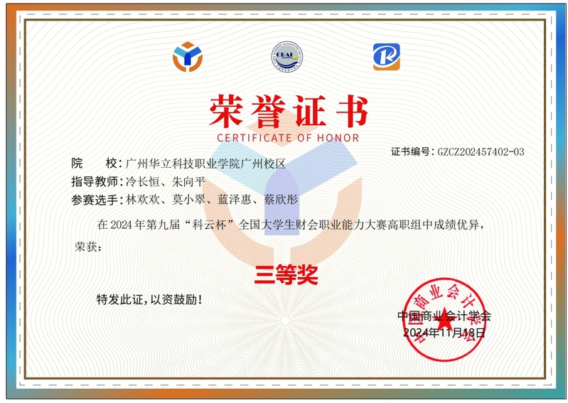 第九屆科云杯全國大學(xué)生財(cái)會職業(yè)能力大賽(三等獎)