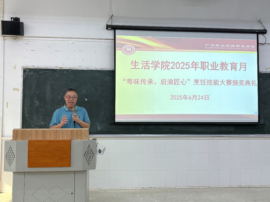 陳顯強副校長在致辭中高度肯定了此次大賽的成果:這場賽事不僅展現了同學們扎實的專業(yè)功底,更體現了職業(yè)教育'德技并修'的育人理念。希望同學們以此次比賽為新起點,在傳承粵菜文化的道路上不斷精進,為餐飲行業(yè)發(fā)展貢獻青春力量。