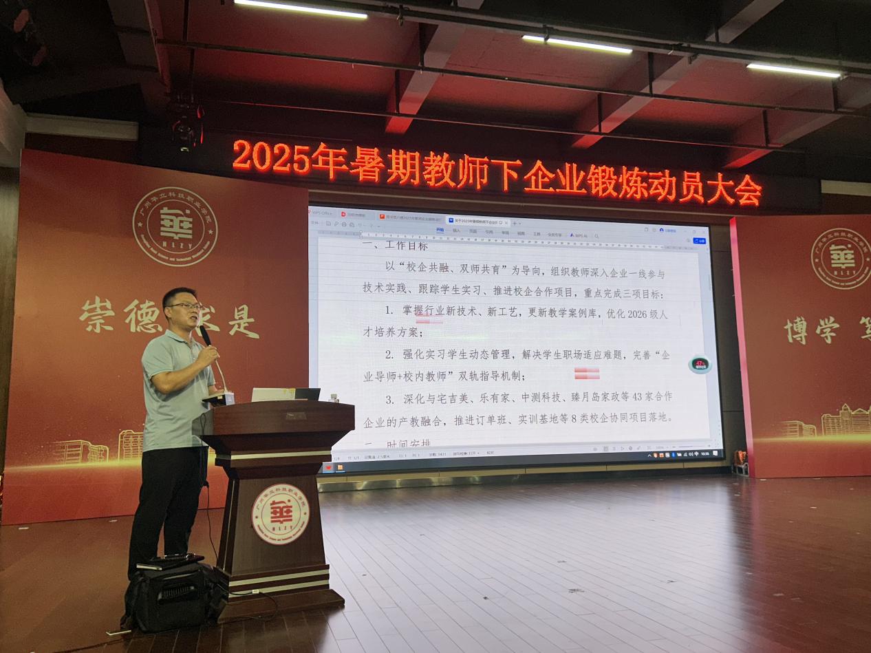為進(jìn)一步加強(qiáng)“雙師型”教師隊(duì)伍建設(shè),提升教師實(shí)踐教學(xué)能力,促進(jìn)學(xué)校人才培養(yǎng)與企業(yè)需求緊密對(duì)接,2025年7月15日,我校召開(kāi)2025年暑期教師企業(yè)實(shí)踐動(dòng)員大會(huì)。全體參與企業(yè)實(shí)踐的教師齊聚一堂,共同為即將開(kāi)啟的企業(yè)實(shí)踐之旅加油鼓勁。