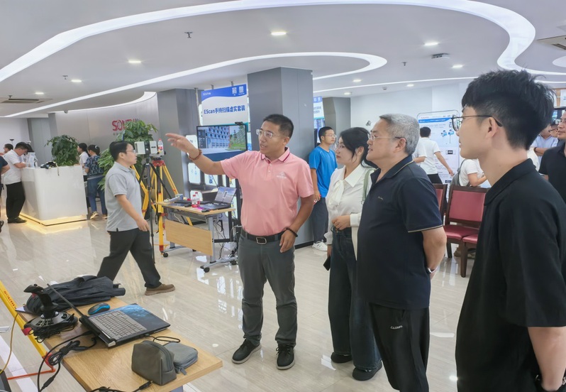會上,徐耀鑒、張志恒一行與企業(yè)的工作人員積極討論有關(guān)南方的最新產(chǎn)品與技術(shù)。期間,南方測繪集團(tuán)副總經(jīng)理郭寶宇在現(xiàn)場講解公司的發(fā)展歷程同時(shí)也對虛擬仿真教學(xué)系統(tǒng)、測量機(jī)器人、三維激光林業(yè)實(shí)訓(xùn)室等進(jìn)行了詳細(xì)的展示與介紹。