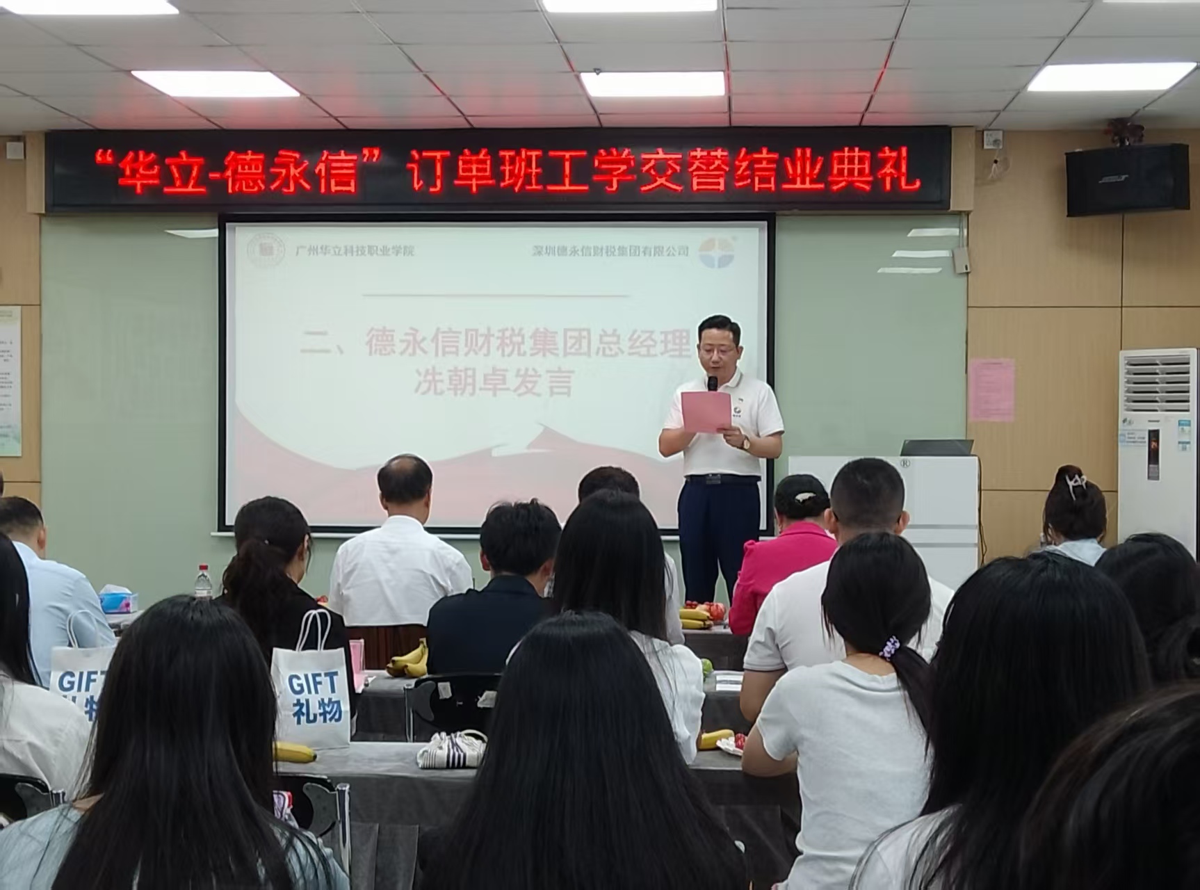 2025年4月24日,廣州華立科技職業(yè)學(xué)院經(jīng)濟管理學(xué)院大數(shù)據(jù)與會計專業(yè)第一、二批工學(xué)交替班結(jié)業(yè)典禮暨第三批工學(xué)交替班啟動活動在深圳德永信財稅集團有限公司總部隆重舉行。深圳德永信財稅集團有限公司總經(jīng)理冼朝卓、廣州華立科技職業(yè)學(xué)院黨委書記陳良聲、校長助理張劍鋒、經(jīng)濟管理學(xué)院院長劉惠玲、副院長朱向平、劉軍根,相關(guān)負責人、指導(dǎo)教師以及全體學(xué)員齊聚一堂,共同見證了這一重要時刻。