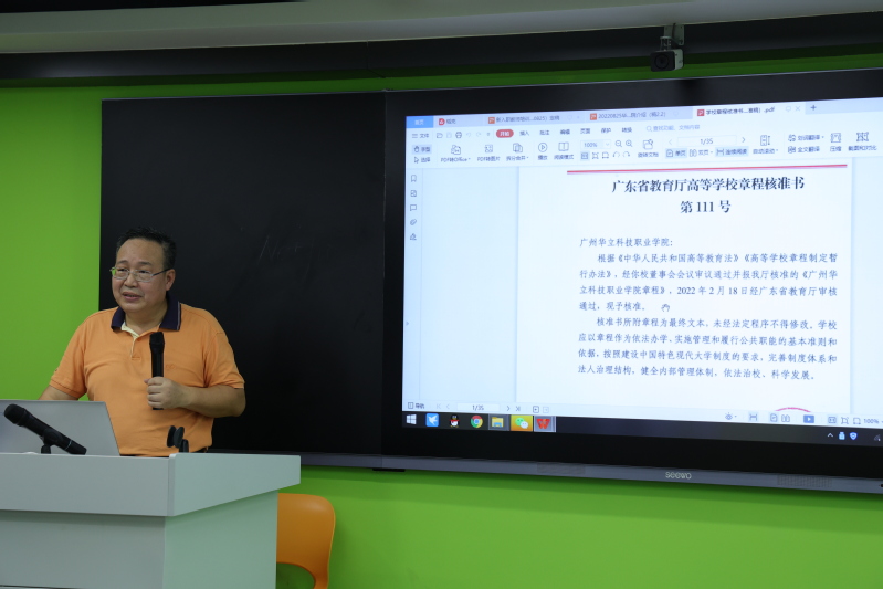 接著,工會副主席朱少先對學(xué)校的基本情況作了一個全面簡介,包括學(xué)校的發(fā)展簡史、職能部門及二級學(xué)院的分布情況等,重點介紹了學(xué)校的辦學(xué)理念和學(xué)校文化,帶領(lǐng)大家一同學(xué)習(xí)學(xué)校章程,希望新入職教師通過培訓(xùn)了解華立文化,盡快融入華立大家庭。