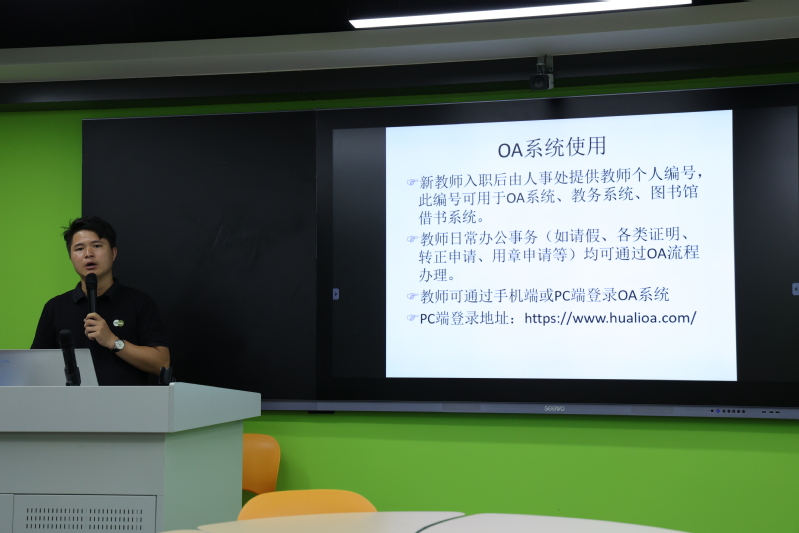 新入職教師培訓(xùn)分上、下午兩場進(jìn)行,第一場主要介紹學(xué)校的辦學(xué)理念、華立文化及人事制度、辦事指南,第二場主要介紹學(xué)校教學(xué)、科研的要求及實訓(xùn)設(shè)備的使用方法。