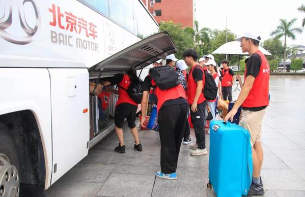 大巴車早早的在校門口等待,一個(gè)個(gè)身穿紅馬甲的志愿者不畏烈日,不畏辛苦把同學(xué)們的行李、學(xué)校準(zhǔn)備好的物資一件一件的搬上大巴車。