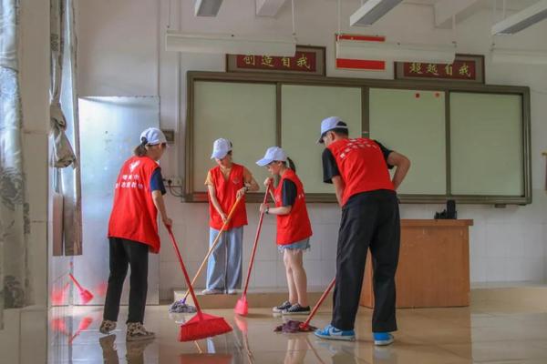 接著,三個(gè)團(tuán)總支老師,在校門口組織志愿者們開一個(gè)短會(huì),分配打掃任務(wù).從教室、宿舍、走廊、廁所再到廚房,經(jīng)過志愿者的默默奉獻(xiàn)都變得煥然一新。