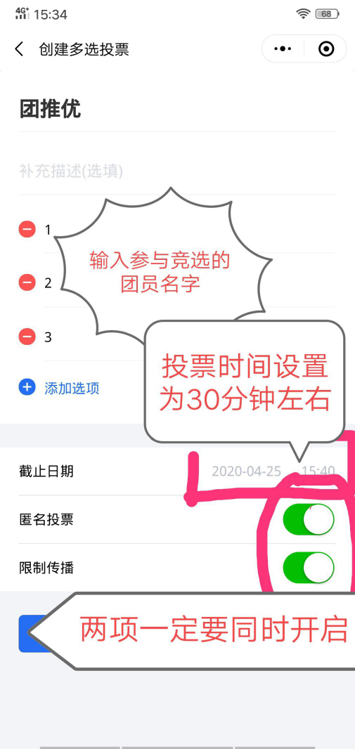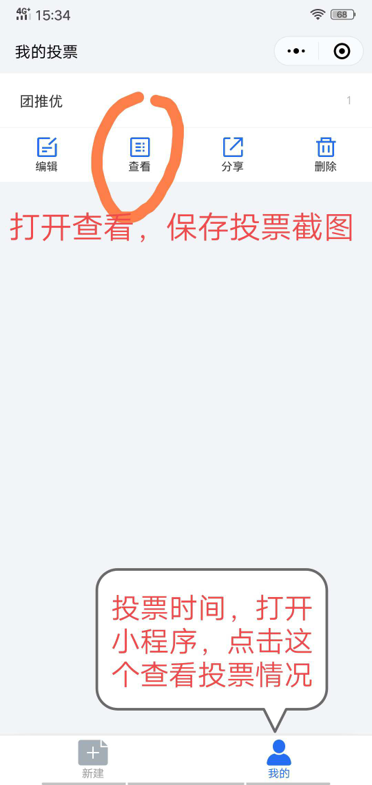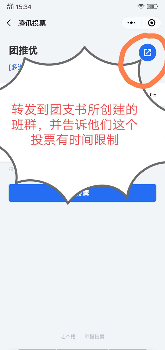 (3)與會團(tuán)員對符合“團(tuán)推優(yōu)”條件的團(tuán)員進(jìn)行線上民主評議并用微信小程序騰訊投票進(jìn)行投票并且由投票發(fā)起人截圖唱票;(詳細(xì)投票過程請根據(jù)附件四進(jìn)行)